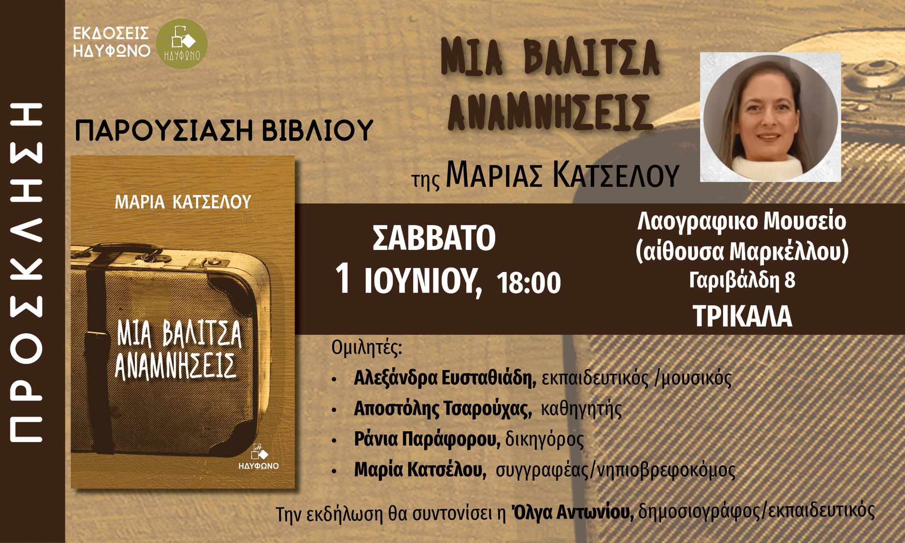 H συγγραφέας Μαρία Κατσέλου, με καταγωγή από τα Τρίκαλα, παρουσιάζει το νέο της βιβλίο με τίτλο «Μία βαλίτσα αναμνήσεις» που κυκλοφορεί από τις εκδόσεις Ηδύφωνο.