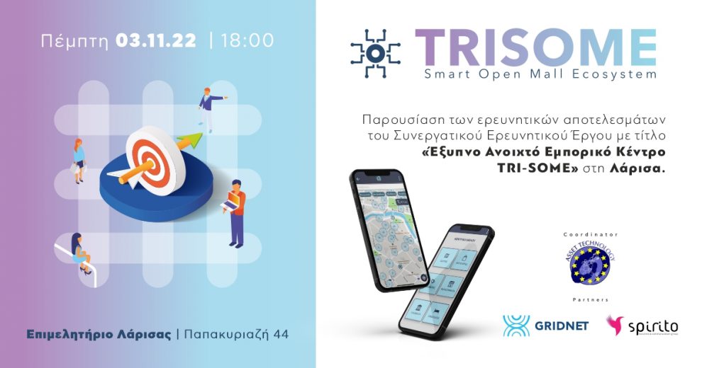 Την Πέμπτη, 3 Νοεμβρίου 2022, στις 18:00, στο Επιμελητήριο Λάρισας, θα πραγματοποιηθεί η «Παρουσίαση των ερευνητικών αποτελεσμάτων του Συνεργατικού Ερευνητικού Έργου “TRI-SOME” και της έξυπνης πλατφόρμας παροχής υπηρεσιών για δράσεις τουριστικού, πολιτιστικού και εμπορικού ενδιαφέροντος οργανισμών και δήμων» στην πόλη της Λάρισας.