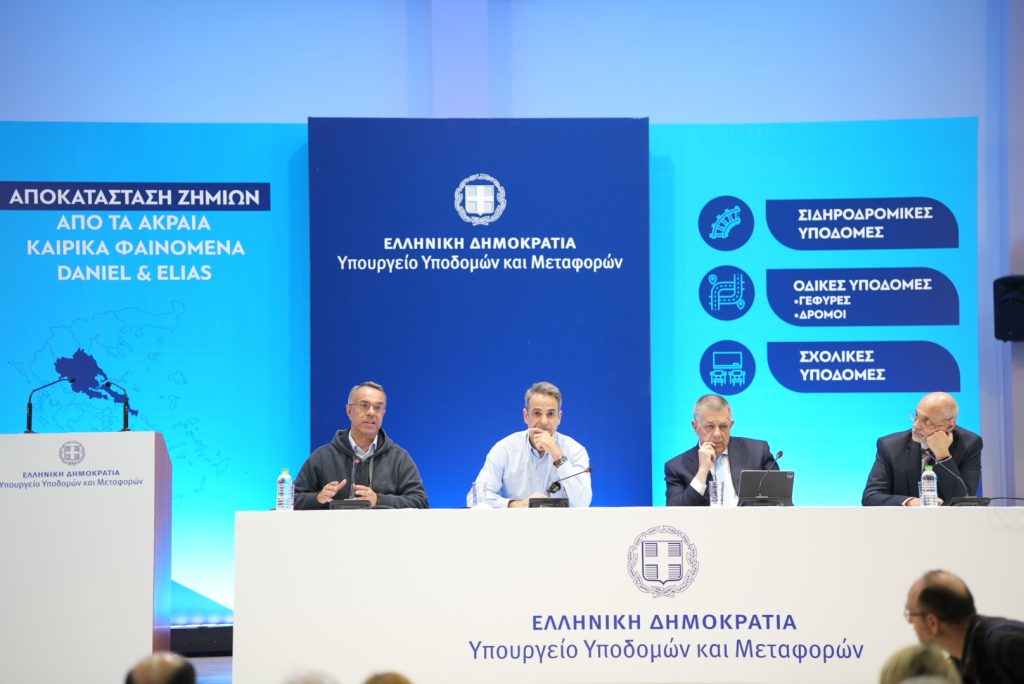 Το σχέδιο αποκατάστασης ζημιών από τα ακραία καιρικά φαινόμενα «Daniel» και «Elias», σε Σχολικές, Σιδηροδρομικές και Οδικές Υποδομές στη Θεσσαλία και τη Στερεά Ελλάδα, παρουσίασαν σήμερα στο Μουζάκι Καρδίτσας, ο Υπουργός Υποδομών και Μεταφορών Χρήστος Σταϊκούρας, ο Υφυπουργός Υποδομών και Μεταφορών, αρμόδιος για τις Υποδομές Νίκος Ταχιάος και ο Γενικός Γραμματέας Υποδομών Κωνσταντίνος Μαγουλάς, παρουσία του Πρωθυπουργού Κυριάκου Μητσοτάκη.