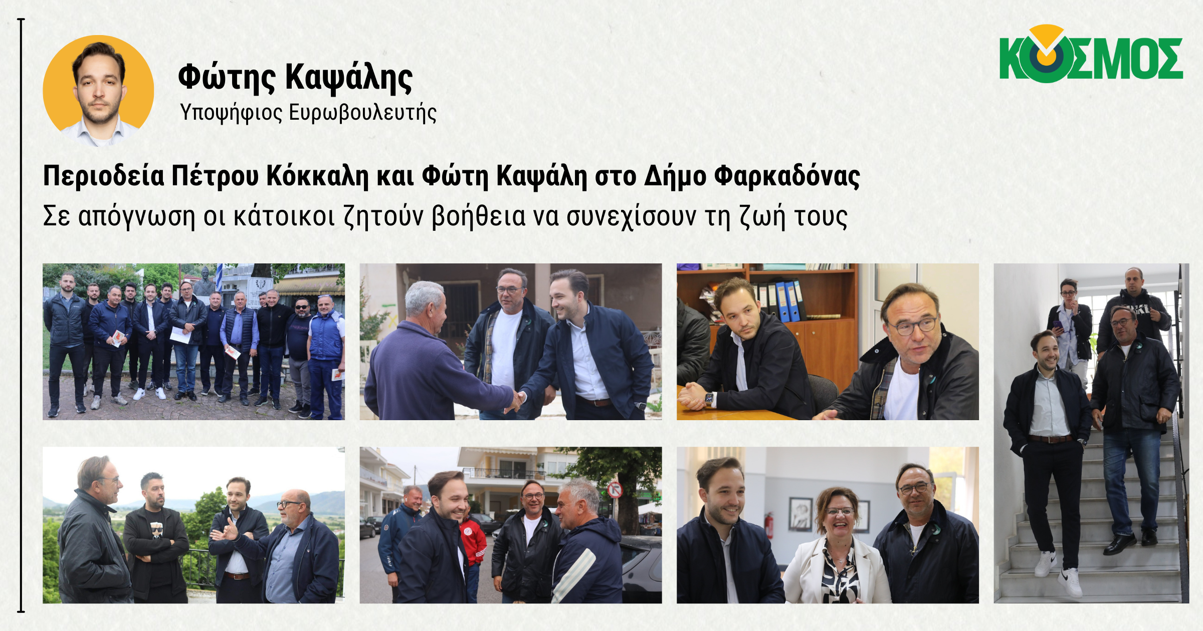 Ο Ευρωβουλευτής των Πρασίνων και Γραμματέας του ΚΟΣΜΟΣ, Πέτρος Κόκκαλης και ο υποψήφιος Ευρωβουλευτής του κόμματος, Φώτης Καψάλης, πραγματοποίησαν κοινή περιοδεία στο Δήμο Φαρκαδόνας.