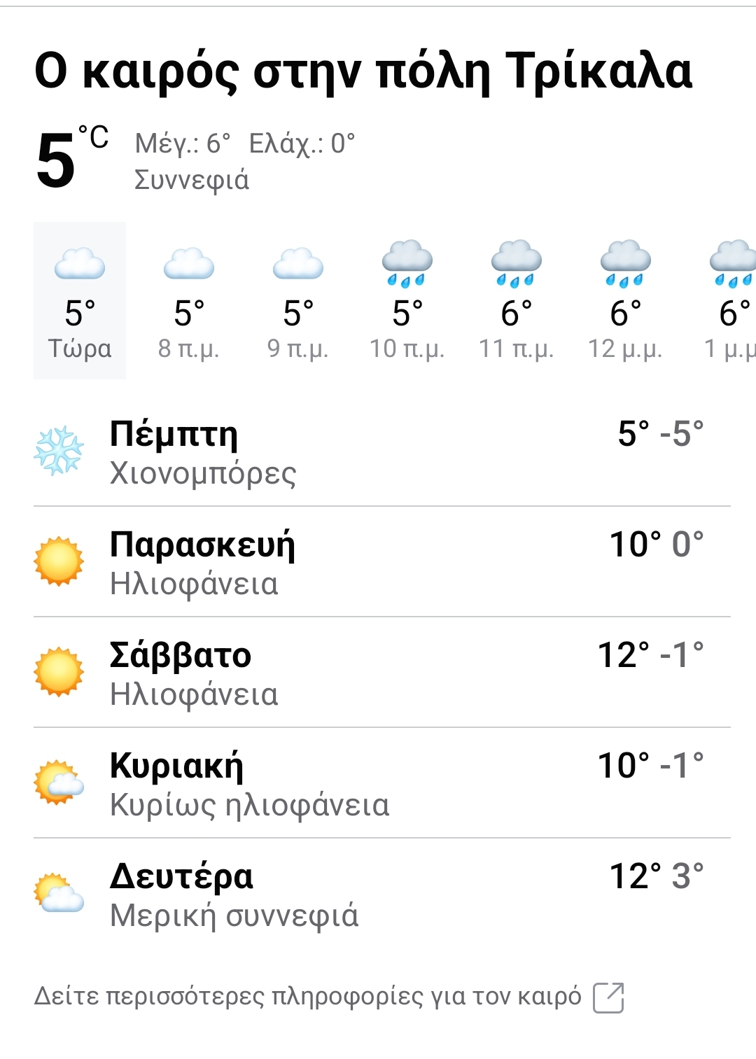 Μάλιστα υπάρχει πρόγνωση και για πιθανές χιονομπόρες το πρωί της Πέμπτης και μέσα στην πόλη των Τρικάλων. Η θερμοκρασία δε θα πέσει έως -5 C αύριο!!! Δείτε παρακάτω: