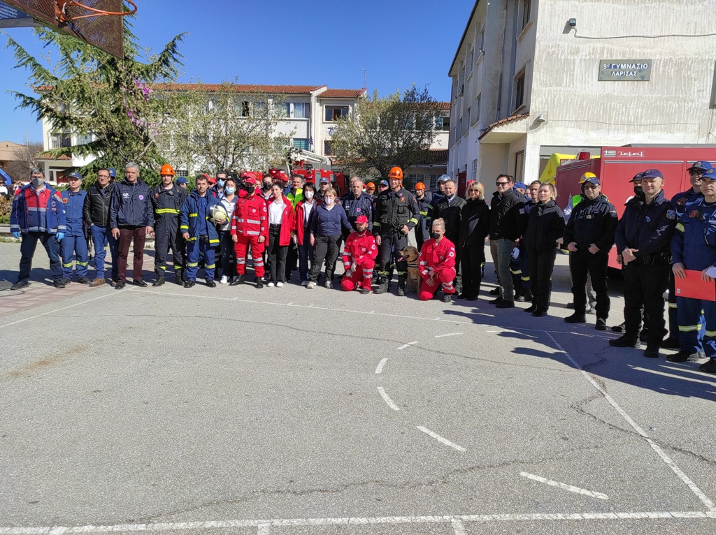 Στην άσκηση συμμετείχαν η Αυτοτελής Διεύθυνση Πολιτικής Προστασίας και Τμήματα Πολιτικής Προστασίας της Περιφέρειας Θεσσαλίας, ο Συντονιστής Πολιτικής Προστασίας Περιφέρειας Θεσσαλίας, δυνάμεις της Πυροσβεστικής Υπηρεσίας Ν. Λάρισας (1ος Π.Σ. & 3ος Π.Σ. ΒΙ.ΠΕ.), της 8ης Ε.Μ.Α.Κ. Θεσσαλίας και της Ομάδας Σ.μη.Ε.Α. «ΙΚΑΡΟΣ» το εκπαιδευτικό προσωπικό, ομάδες έκτακτης ανάγκης και μαθητές του 9ου Γυμνασίου Λάρισας, η Ελληνική Αστυνομία, το Ε.Κ.Α.Β., το Πανεπιστημιακό Νοσοκομείο Λάρισας, η Διεύθυνση Πρωτοβάθμιας Εκπαίδευσης Λάρισας, ο Οργανισμός Αντισεισμικού Σχεδιασμού και Προστασίας (Ο.Α.Σ.Π.), η Δ.Ε.Δ.Δ.Η.Ε., η Ε.Δ.Α. Θεσσαλίας , ο Δήμος Λάρισας, η Δημοτική Αστυνομία και Ερυθρός Σταυρός.