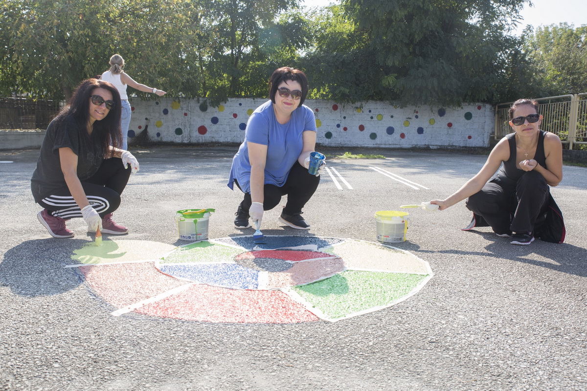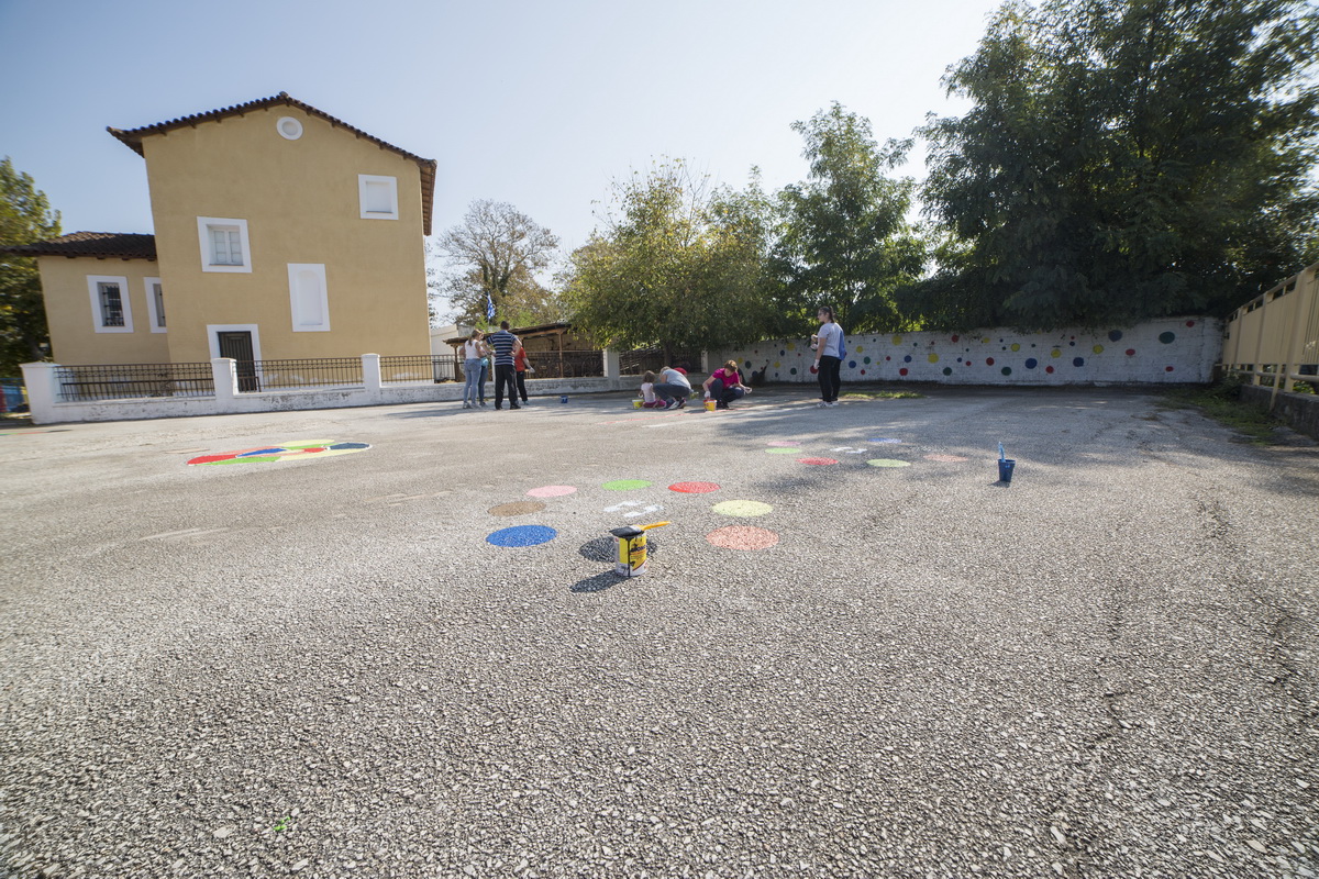 Το προαύλιο του σχολείου μεταμορφώθηκε με πολύχρωμα επιδαπέδια παιχνίδια ,που δημιουργήθηκαν για να περνούν στιγμές ανεμελιάς οι μικροί μαθητές. Στην είσοδο του Νηπιαγωγείου ξεχωρίζει το δέντρο της γνώσης , το οποίο φιλοτέχνησε η ίδια η κ. Σχιζοδήμου! Χάρη στην άψογη συνεργασία όλων και την άμεση ανταπόκριση του Δήμου Τρικκαίων και της Σχολικής Επιτροπής με τη δωρεά των χρωμάτων η δράση στέφθηκε με επιτυχία δίνοντας στα παιδιά το καλό παράδειγμα της ομαδικότητας , της ευγενούς άμιλλας και της συμετοχικότητας!!!