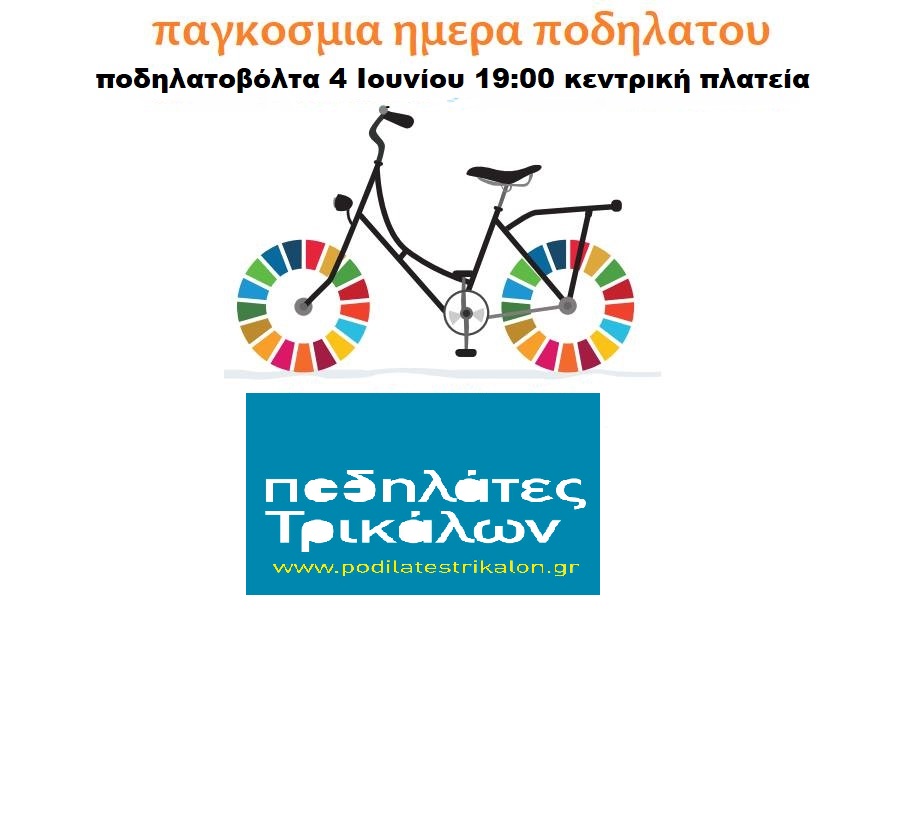 Οι Ποδηλάτες Τρικάλων διοργανώνουν ποδηλατοβόλτα για την παγκόσμια ημέρα ποδηλάτου το Σάββατο 4 Ιουνίου με σημείο συνάντησης την κεντρική πλατεία στις 19:00 .