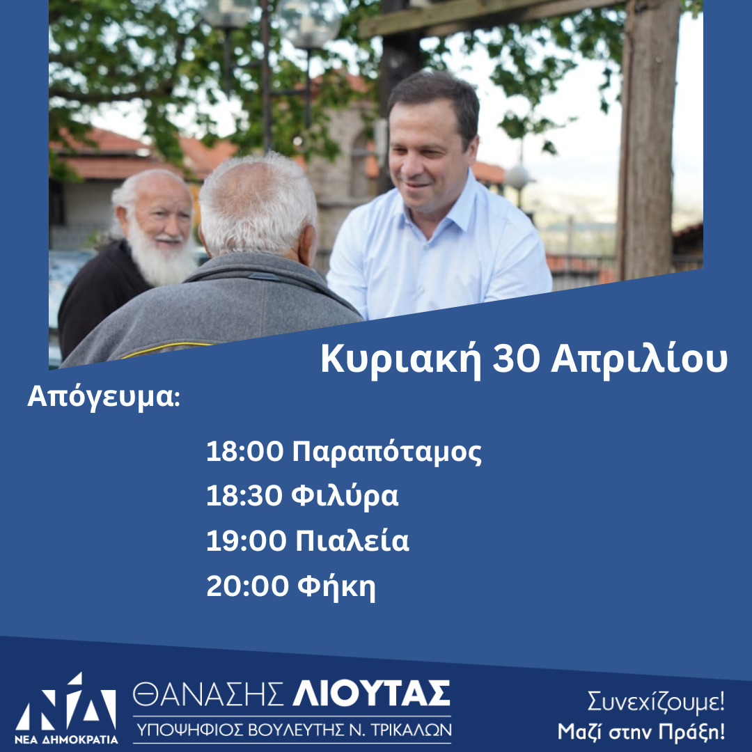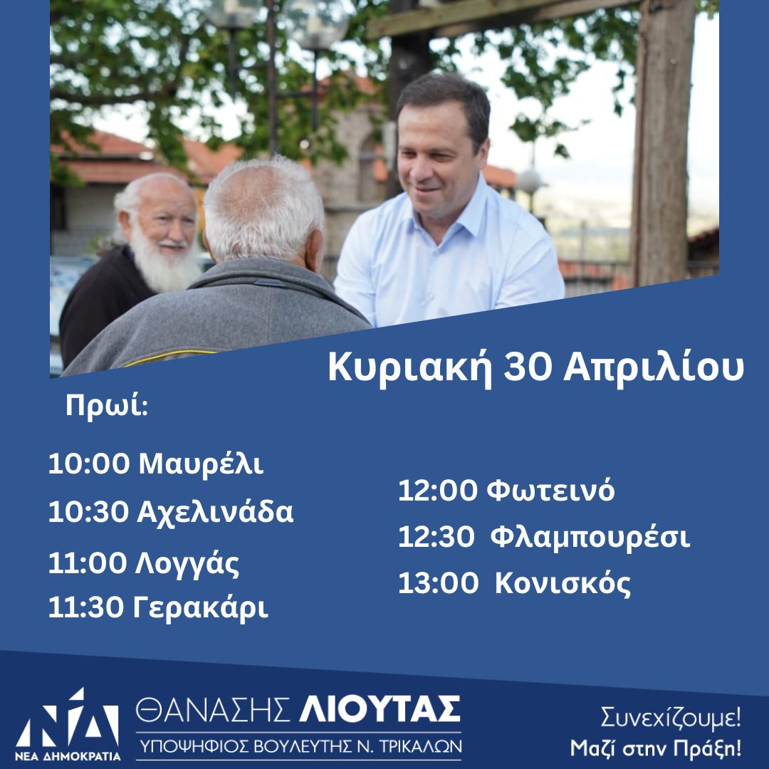 Το απόγευμα της Παρασκευής 28 Απριλίου, ο Υποψήφιος Βουλευτής της ΝΔ στο Νομό μας Θανάσης Λιούτας, επισκέφτηκε τον Άγιο Προκόποιο, τους Καλόγηρους, το Βροντερό, την Ελάτη, το Κοτρώνι, το Ροπωτό και τα Στουρναραίικα.