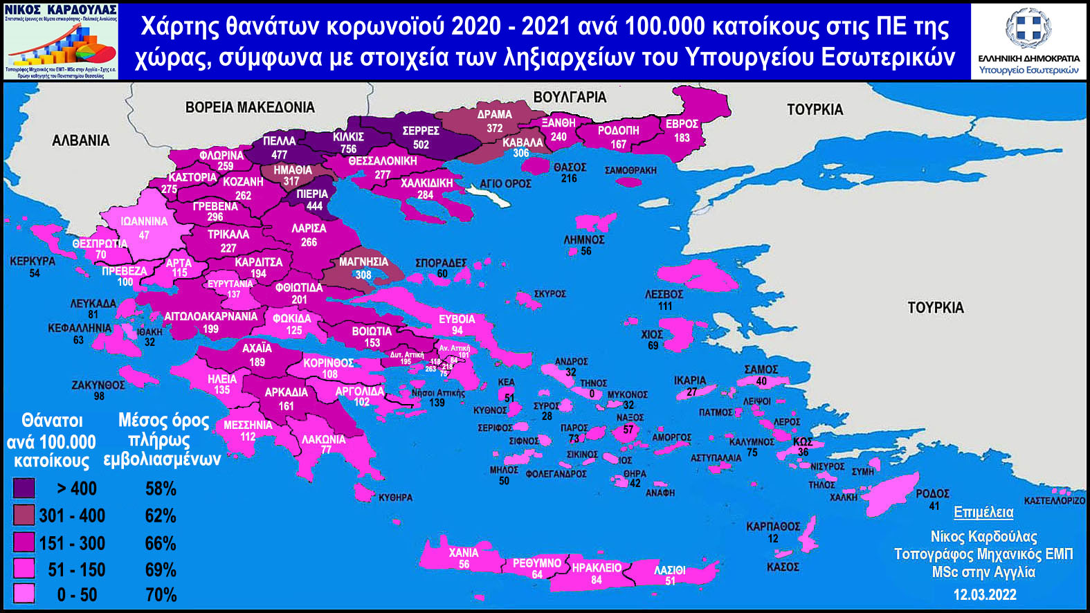 - Τέσσερις (4) ΠΕ κατέγραψαν από 301 έως 400 θανάτους (Δράμας, Ημαθίας, Μαγνησίας και Καβάλας), με μέσο όρο ποσοστού πλήρως εμβολιασμένων 62%.