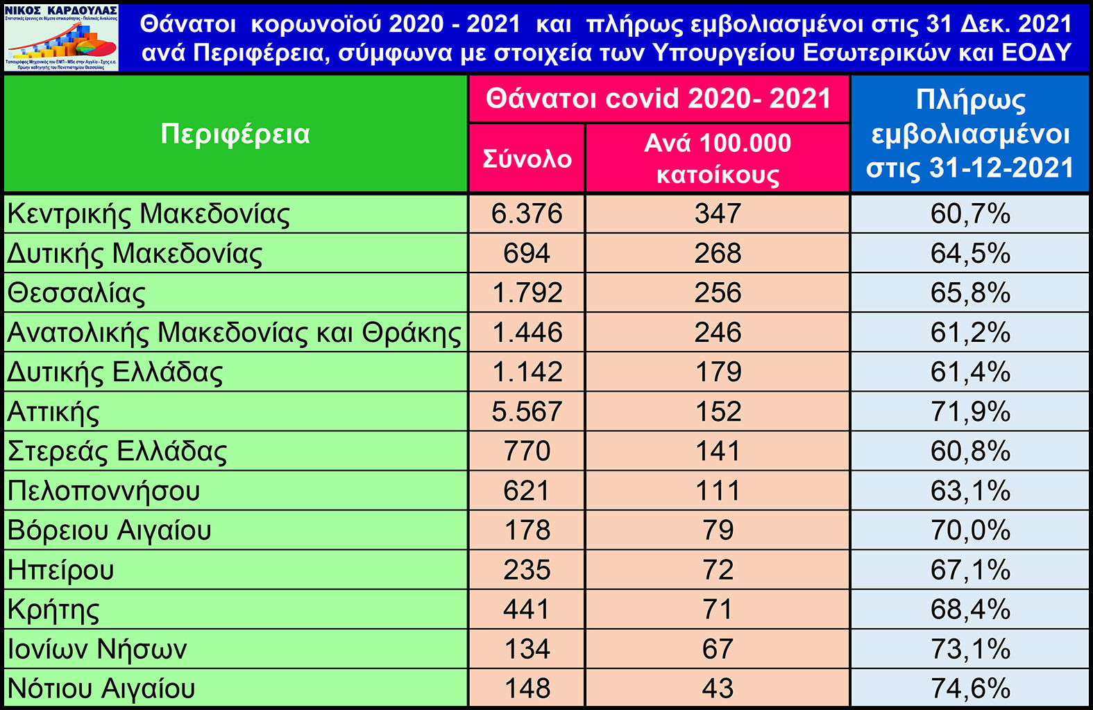 Στον παρακάτω πίνακα απεικονίζονται οι θάνατοι λόγω covid-19 των ετών 2020 και 2021, σύμφωνα με τις ληξιαρχικές πράξεις θανάτου λόγω covid-19 που ανακοίνωσε το Υπουργείο Εσωτερικών. Στον πίνακα απεικονίζονται επίσης και τα ποσοστά των πλήρως εμβολιασμένων των Περιφερειών στις 31 Δεκεμβρίου 2021, σύμφωνα με στοιχεία του ΕΟΔΥ.