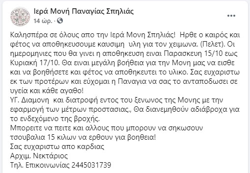 Ο Ηγούμενος της ιστορικής Μονής των Αγράφων Αρχιμανδρίτης Νεκτάριος Μητρόπουλος ο οποίος αναστήλωσε εκ βάθρων τη “Παναγία Σπηλιά” καλεί πνευματικά του παιδιά και πιστούς να προστρέξουν, εφόσον δύνανται και μπορούν, να βοηθήσουν στην αποθήκευση των υλικών που χρειάζονται για τη θέρμανση των χώρων.