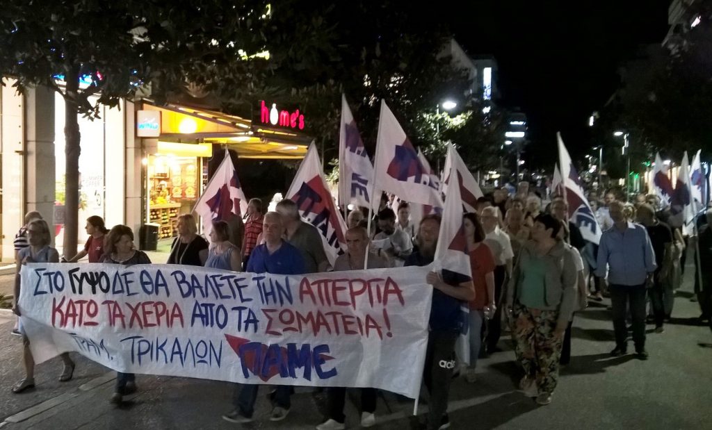 Στη συγκέντρωση που πραγματοποιήθηκε το βράδυ της Τετάρτης ,στην πλατεία Ρήγα Φεραίου των Τρικάλων, μίλησε ο Πέτρος Τσίγκας, μέλος της διοίκησης του Σωματείου Ιδιωτικών υπαλλήλων Τρικάλων και του εργατικού κέντρου Τρικάλων και μεταξύ των άλλων τόνισε: «Το πολυνομοσχέδιο, που φέρνει στη Βουλή η κυβέρνηση, προβλέπει τον οριστικό ενταφιασμό των κλαδικών συμβάσεων, την ενίσχυση ξανά των ενώσεων προσώπων, που η σύμβαση την οποία θα υπογράφουν θα υπερισχύει της κλαδικής, όπως και τοπικών κλαδικών συμβάσεων που θα υπερισχύουν έναντι κλαδικών συμβάσεων. Θα θεσπίζει “ηλεκτρονικό μητρώο” και καθιέρωση της ηλεκτρονικής ψηφοφορίας για τις γενικές συνελεύσεις και απεργίες». Ολοκληρώνοντας την ομιλία του απεύθυνε κάλεσμα για αγωνιστική εγρήγορση και συμμετοχή στην Απεργία που έχει προγραμματιστεί απεργία την Τρίτη 24 Σεπτέμβρη. Κάλεσε τους εργαζόμενους να γυρίσουν την πλάτη σε διασπαστικά σχέδια της ξεπουλημένης πλειοψηφίας της ΓΣΕΕ και να απεργήσουν μαζικά στην απεργία στις 24 Σεπτέμβρη που έχουν κηρύξει Ομοσπονδίες και η ΑΔΕΔΥ.