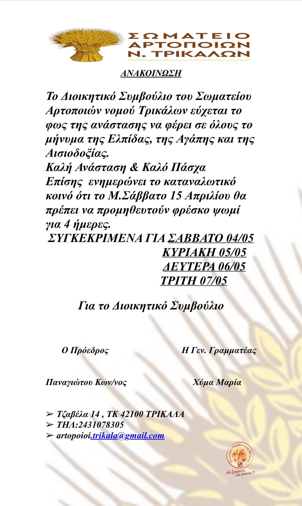 Με συνεχόμενο ωράριο 8.30 π.μ. με 3 μ.μ. θα λειτουργήσουν τα καταστήματα των Τρικάλων το Μεγάλο Σάββατο.
