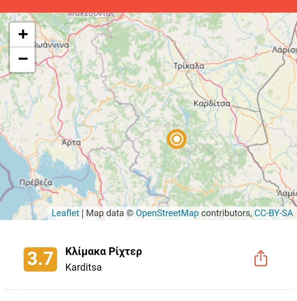 Ισχυρή σεισμική δόνηση μεγέθους 3,7 Ρίχτερ σημειώθηκε στις 23.38 το βράδυ της Παρασκευής 40 χλμ. Νοτιοδυτικά της Καρδίτσας, στην περιοχή της λίμνης Πλαστήρα.