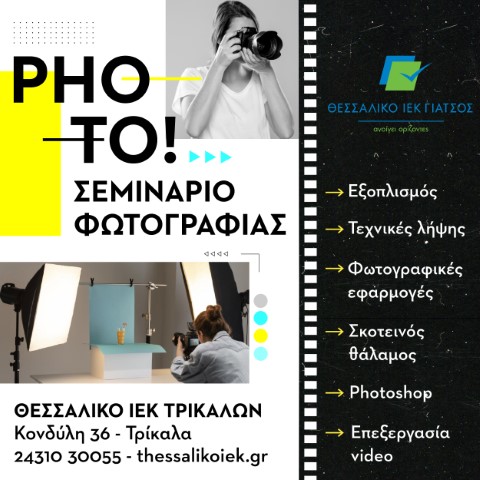 To ΘΕΣΣΑΛΙΚΟ ΙΕΚ ΤΡΙΚΑΛΩΝ διοργανώνει Σεμινάριο Φωτογραφίας για όσους θέλουν να εξοικειωθούν με την τέχνη της φωτογραφίας.