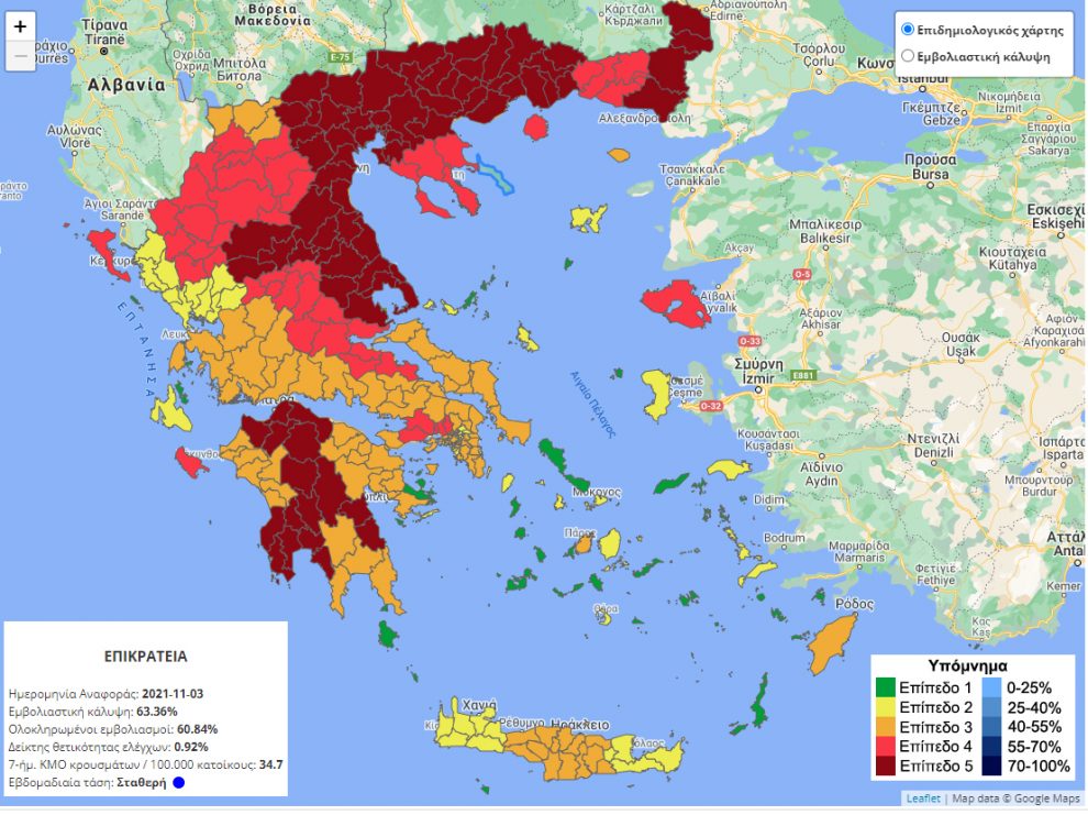 Είναι χαρακτηριστικό πως στον συνδυαστικό χάρτη κρουσμάτων-αριθμού τεστ και δείκτη θετικότητας τις τελευταίες 14 ημέρες, ολόκληρη η ηπειρωτική Ελλάδα, τα νησιά του Ιονίου και η Κρήτη είναι στο «πορτοκαλί» και στο «βαθύ κόκκινο», ενώ ελαφρώς καλύτερη είναι η κατάσταση στα νησιά του Αιγαίου, τα οποία βρίσκονται στο «κίτρινο». Πιο συγκεκριμένα, στο «βαθύ κόκκινο» βρίσκονται Θεσσαλία, Θράκη και το μεγαλύτερο μέρος της Μακεδονίας.
