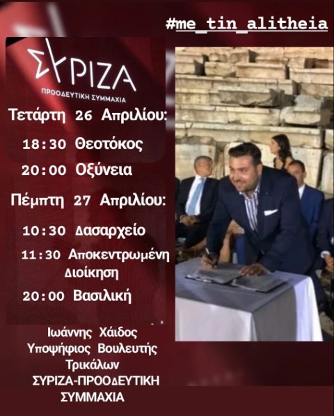 Το απόγευμα του Σαββάτου επισκέφτηκε τα χωριά Ρίζωμα και Ράξα και κατέληξε στη γιορτή στο εξωκλήσι του Άη Γιώργη στην Πηγή του Δήμου Πύλης. Κυριακή πρωί βρέθηκε στο Ζάρκο και το Γριζάνο… “Δυστυχώς στο Ζάρκο καμία πρόοδος για όσους επλήγησαν από τον εγκέλαδο πριν 2 χρόνια και ακόμη τραβούνε το δικό τους Γολγοθά μέσα στα ελάχιστα τετραγωνικά των κοντέινερς της ντροπής” λέει “επίσης το χαλάζι που έπεσε το απόγευμα του Σαββάτου, έπληξε μονάδες κτηνοτροφίας εξαιτίας μισοτελειωμένων έργων απορροής. Στο Γριζανο η απογοήτευση του κόσμου στην πρώτη γραμμή , με τους νέους να βρίσκουν διέξοδο μόνο στην αγορά εργασίας των βορείων χωρών. Συνεχίζουμε δυναμικά και δίνουμε μια υπόσχεση… Η κοινωνία θα επιστρέψει πρωταγωνίστρια και οι ζωές των ανθρώπων θα είναι το βαρόμετρο της κάθε πολιτικής και όχι τα κέρδη των λίγων φίλων όσων προδίδουν τη λαϊκή εντολή…”.