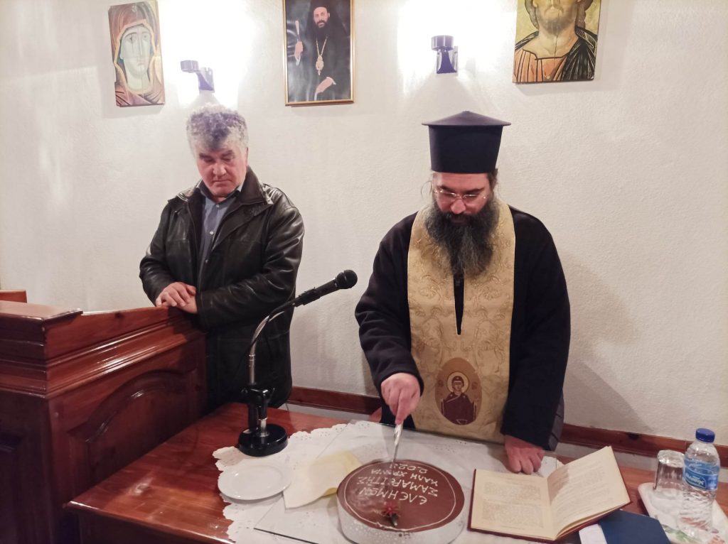 Ο π. Νικόλαος Ευλόγησε την Βασιλόπιτα της Αδελφότητας και μετέφερε τις Πατρικές ευχές και Ευλογίες του Σεβασμιωτάτου Μητροπολίτου Τρίκκης, Γαρδικίου και Πύλης κ.κ. Χρυσοστόμου. Ο Πρόεδρος της Αδελφότητος κ. Κοσμάς Μπαλούτσος μετέφερε τον χαιρετισμό του Υπουργού Περιβάλλοντος και Ενέργειας κ. Σκρέκα και προγραμματίστηκαν οι επόμενες πνευματικές εξορμήσεις ως εξής: 1) Ημερήσια Προσκυνηματική Εκδρομή σε Μοναστήρια των Σερρών το Σάββατο 11 Φεβρουαρίου (Πληροφορίες 6980245237) 2) Ιερά Αγρυπνία με Μνημόσυνο στον π. Χαρίτωνα Μανιτάρα την Τετάρτη 22 Φεβρουαρίου στον Ι.Ν. Αγίων Κωνσταντίνου & Ελένης Τρικάλων. Οι Ομιλίες συνεχίζονται κάθε Δευτέρα απόγευμα στις 6.00 στην αίθουσα της Χριστιανικής Αδελφότητας (Στουρνάρα 11) με νέο κύκλο Ομιλιών «Ανεβαίνοντας την Κλίμακα του Αγίου Ιωάννου του Σιναΐτου».