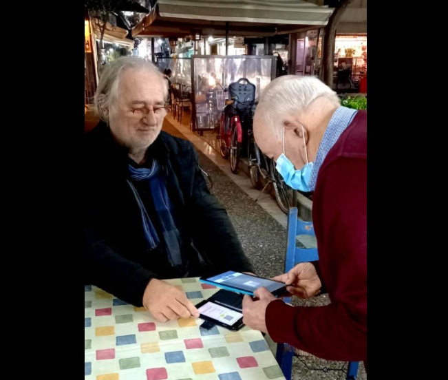 Διακρίνεται να… σκανάρει το πιστοποιητικό εμβολιασμού του συντρόφου Γιώργου Χονδρού ο οποίος επέστρεψε από τα ξένα και είπε να γευτεί κεμπάπ αγνό και περιποιημένο!!!… Ωραίοι…