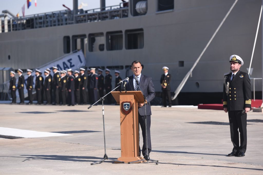 Ο Γιώργος Λαϊάκης εκ της Τζούρτζιας Ασπροποτάμου καταγόμενος διακρίνεται δίπλα στον υπουργό Άμυνας κατά την τελετή ονοματοδοσίας και ένταξης στο Πολεμικό Ναυτικό του πλοίου Γενικής Υποστήριξης «ΑΤΛΑΣ-1», που πραγματοποιήθηκε τη Δευτέρα στις εγκαταστάσεις του Ναύσταθμου Σαλαμίνας.