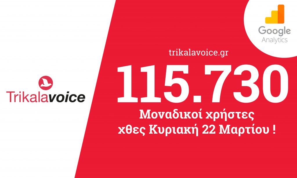 115.730 μοναδικοί χρήστες επέλεξαν χθες Κυριακή 22 Μαρτίου το trikalavoice.gr για να ενημερωθούν για όσα συμβαίνουν στα Τρίκαλα, στην Ελλάδα και τον κόσμο.