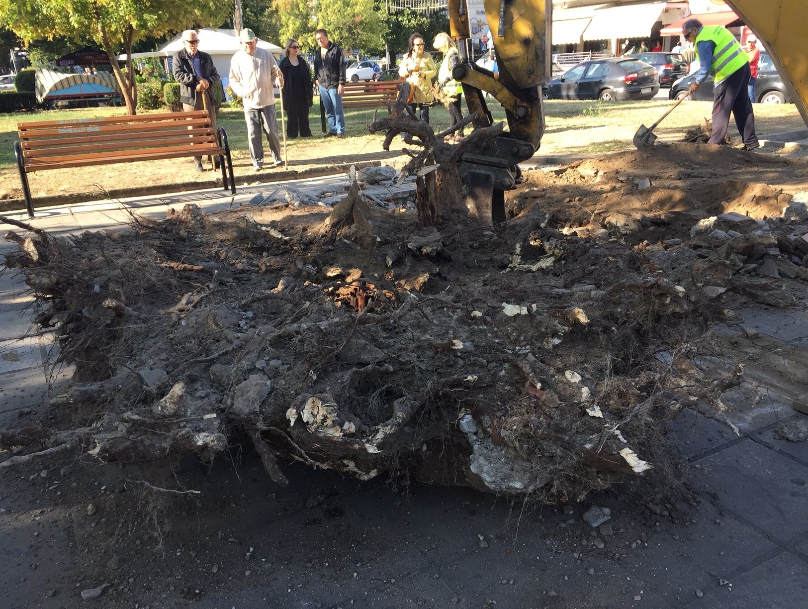 Συγκεκριμένα ο πλάτανος, ο οποίος είχε ξεπεράσει σε ύψος τα 15 μέτρα, είχε ρίζες…μόλις 70 εκατοστών (!!!) και παρέμενε άκρως επικίνδυνος να πέσει ακόμη και χωρίς… αεράκι. Ο σφένδαμος, που επίσης κόπηκε μέσα στη βδομάδα είχε ένα σάπιο ριζικό σύστημα λίγων εκατοστών.