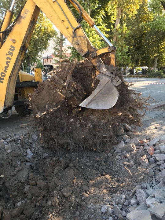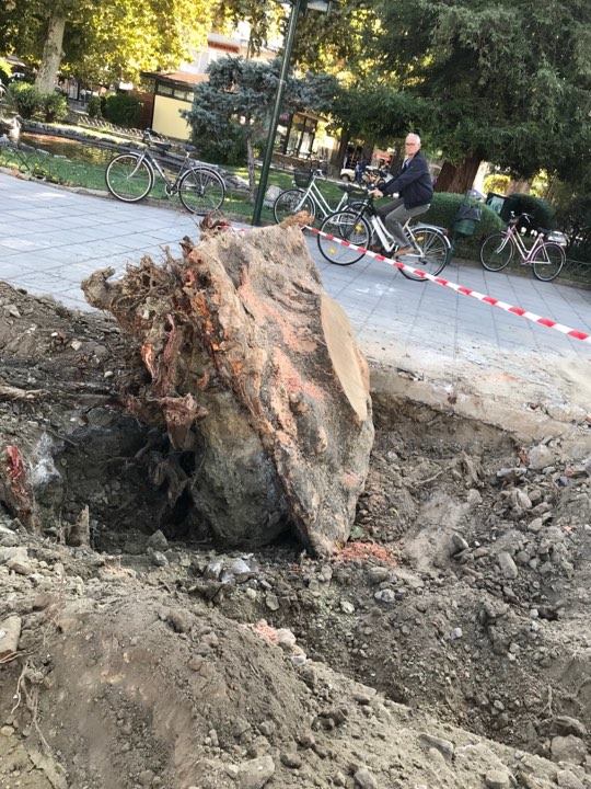 Σε εξέλιξη οι εργασίες κοπής δέντρων στην κεντρική πλατεία Τρικάλων, όπου διαπιστώθηκε ότι δυο από αυτά που ήδη κόπηκαν είχαν σάπιες ρίζες.