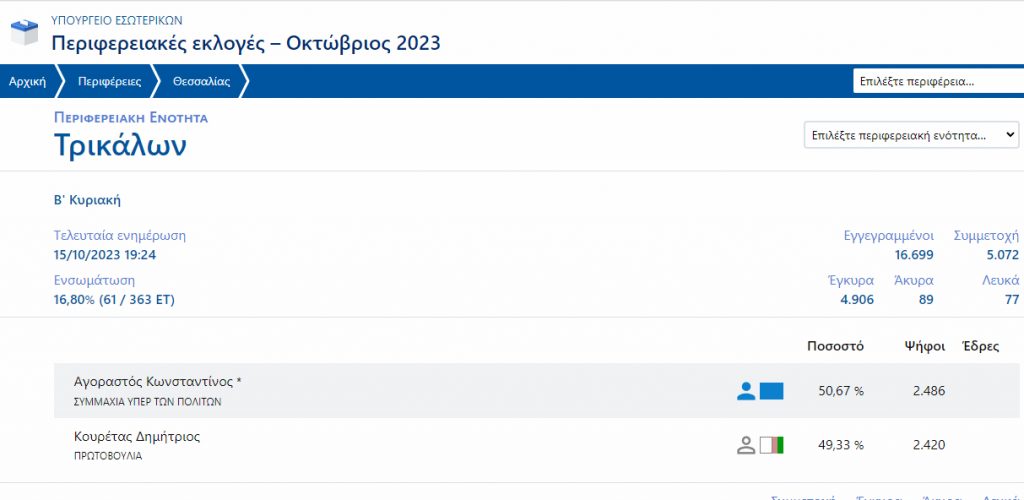 Έπεσε και το κάστρο των Τρικάλων στον β΄ γύρο των περιφερειακών εκλογών.