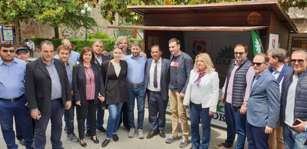 Επισκέφτηκε αρχικά το περίπτερο του ΚΙΝ.ΑΛ. στην αρχή του πεζόδρομου της Ασκληπιού και σε συνομιλία του με στελέχη τόνισε ότι «είναι η πιο κρίσιμη εκλογική μάχη του Κινήματος από το 2012 και μετά, αυτή των ευρωεκλογών. Ο Τσίπρας έχει θέσει ως στόχο να συμπιέσει το κόμμα και να φανεί τη βραδιά των εκλογών ως ο ηγέτης της κεντροαριστεράς». Προέτρεψε δε τα στελέχη να κάνουν αγώνα για να αποτρέψουν ένα τέτοιο ενδεχόμενο.