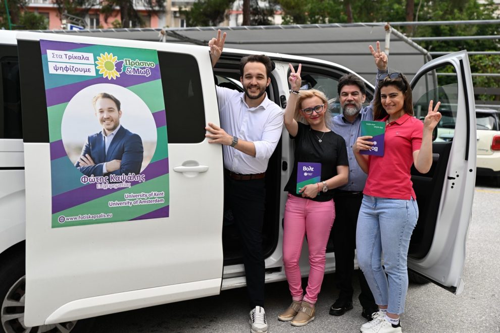 Νίκος Φουρναράκης και Φώτης Καψάλης, περιόδευσαν στον πεζόδρομο της οδού Ασκληπιού, επισκέφτηκαν καφέ της πόλης όπου είχαν την ευκαιρία να συνομιλήσουν με Τρικαλινούς-ες, αναλύοντας θέσεις και προτάσεις του κόμματος του Βολτ Ελλάδας και της συμμαχίας «Πράσινο και Μωβ». Το κλίμα χαρακτηρίστηκε ιδιαίτερα αισιόδοξο και ελπιδοφόρο με τους πολίτες να λαμβάνουν μέρος σε ένα διάλογο, ακούγοντας τις απόψεις για μια εναλλακτική πολιτική, η οποία μπορεί να εξασφαλίσει την επόμενη ημέρα λύσεις.