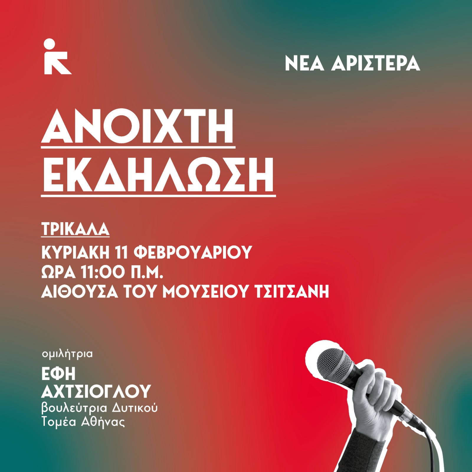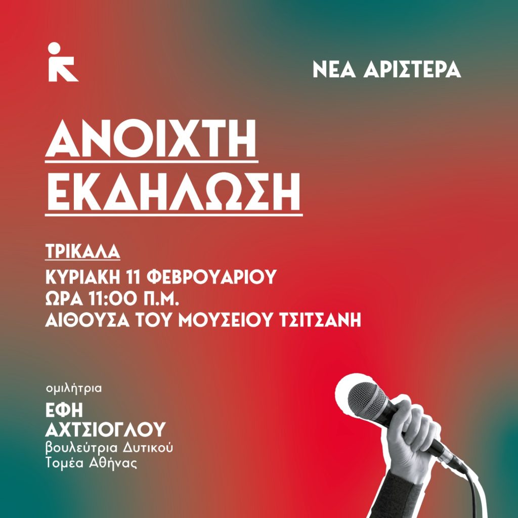 Την Κυριακή 11 Φεβρουαρίου, η βουλεύτρια της ΚΟ της Νέας Αριστεράς κα Έφη Αχτσιόγλου, θα επισκεφθεί τα Τρίκαλα ως εισηγήτρια στην πρώτη ανοιχτή εκδήλωση της Νέας Αριστεράς.