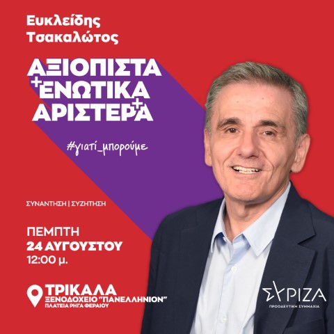 Την Πέμπτη 24 Αυγούστου, ο Ευ. Τσακαλώτος θα επισκεφθεί τα Τρίκαλα όπου θα παραχωρήσει συνέντευξη τύπου στο Ξενοδοχείο ΠΑΝΕΛΛΗΝΙΟΝ (Πλατεία Ρήγα Φεραίου) στις 11:30 π.μ..