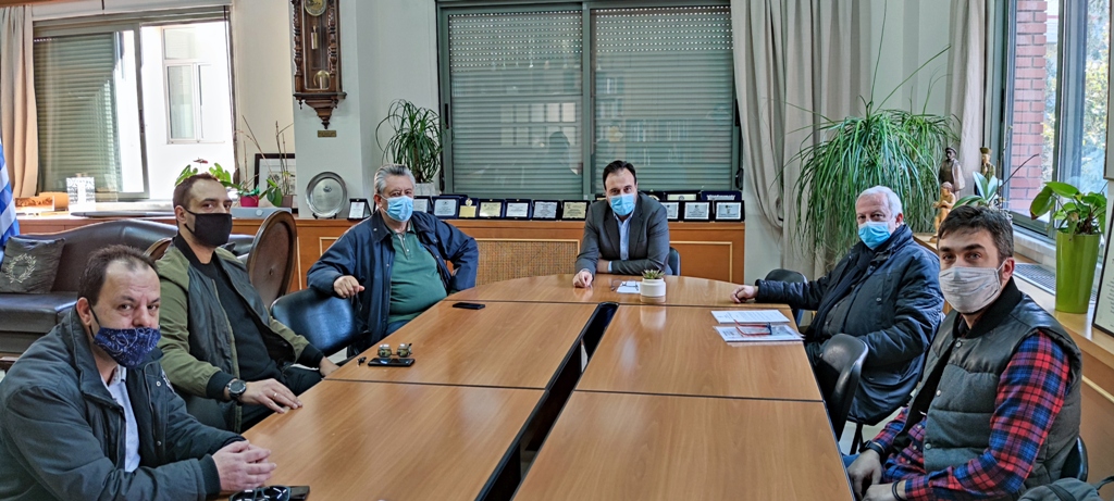 Ο Δημήτρης Παπαστεργίου συναντήθηκε με επιχειρηματίες που εκπροσωπούσαν τον Σύλλογο Εστιατορίων – Fast Food (ο πρόεδρος κ. Ν. Παπαευθυμίου) και τους επιχειρηματίες της περιοχής των «μανάβικων» ( ο κ. Παν. Κούτσικος) στο Δημαρχείο, το Σάββατο 6 Φεβρουαρίου 2021.