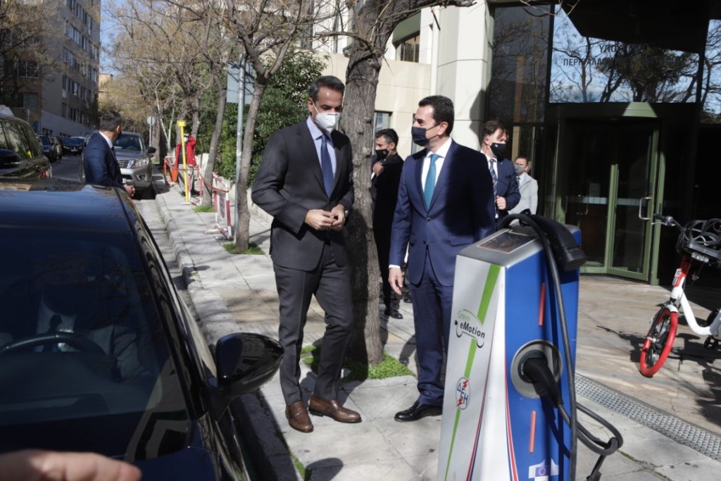 Ο Κ. Σκρέκας υποδέχθηκε τον Πρωθυπουργό που έφτασε στο Υπουργείο Περιβάλλοντος και Ενέργειας στις 12.00 με ένα ηλεκτρικό αυτοκίνητο, το οποίο συνέδεσαν από κοινού στο φορτιστή ηλεκτρικών οχημάτων που βρίσκεται στην είσοδο του Υπουργείου.
