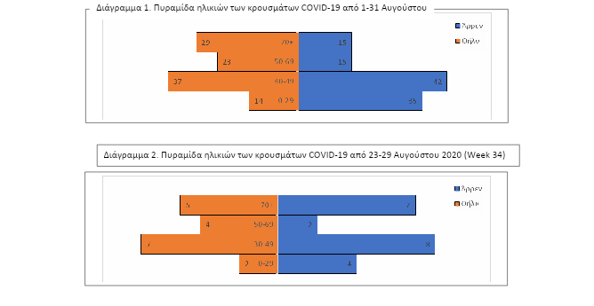 Ομοίως η πλειοψηφία των κρουσμάτων στο σύνολο και στα δύο φύλα ξεχωριστά βρίσκεται στην ηλικιακή ομάδα “30-49”και για την εβδομάδα 23-29 Αυγούστου (week 34) και η δεύτερη συχνότερη πληγείσα ηλικιακή ομάδα και στα δύο φύλα είναι η “>=70”. Η ηλικιακή κατανομή των επιβεβαιωμένων κρουσμάτων της τελευταίας εβδομάδας παρουσιάζεται στον Πίνακα 5 και στο Διάγραμμα 2.