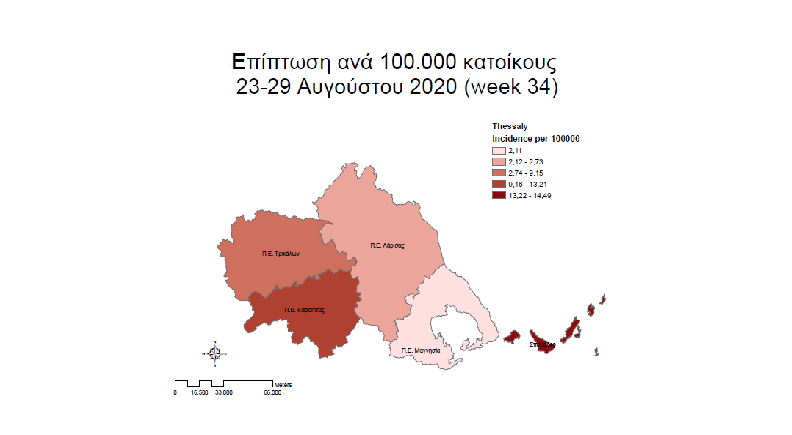 Ο παρακάτω πίνακας και οι χάρτες αποτυπώνουν τη γεωγραφική κατανομή των συνολικών κρουσμάτων και της επίπτωσης COVID-19 από 1-8-20 έως 31-8-20 και από 23-8-2020 έως 29-8-20 (week 34) ανά Περιφερειακή Ενότητα της και Καλλικρατικό δήμο της Θεσσαλίας, με βάση την δηλωθείσα διεύθυνση μόνιμης κατοικίας του κρούσματος ή τη διεύθυνση προσωρινής διαμονής για τους τουρίστες και άλλους προσωρινά διαμένοντες στην Ελλάδα. Συμπεριλαμβάνονται τόσο κρούσματα με ιστορικό ταξιδίου (“εισαγόμενα”) όσο και κρούσματα με πιθανή εγχώρια μετάδοση.