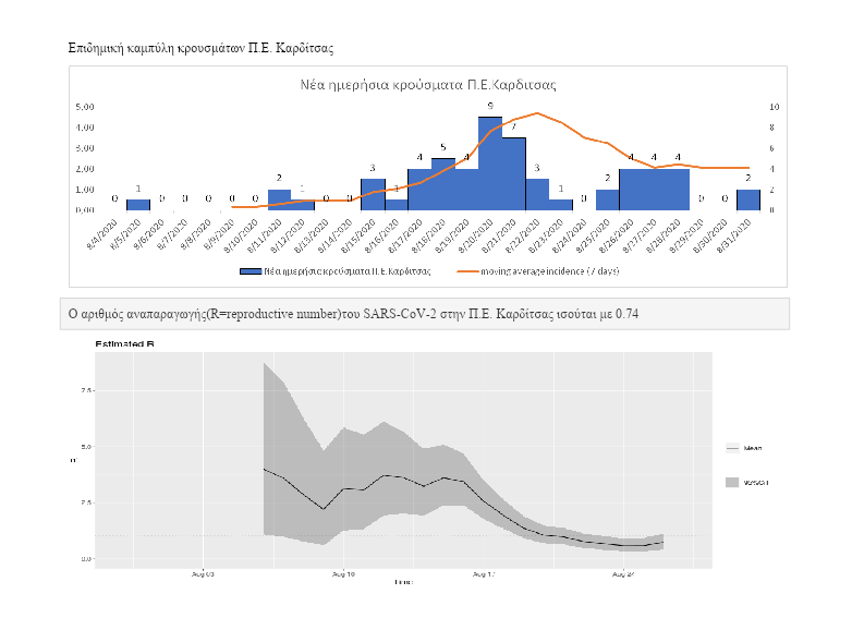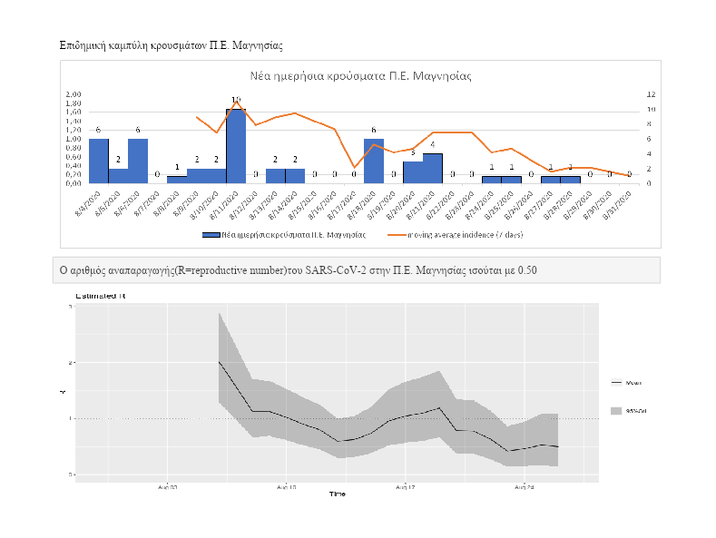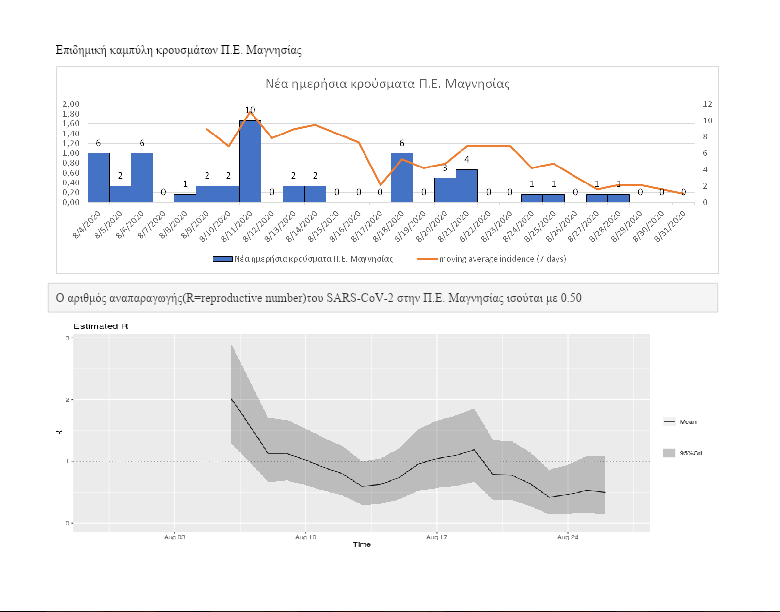 Παρακάτω παρουσιάζεται η ημερήσια κατανομή των επιβεβαιωμένων κρουσμάτων και ο αριθμός αναπαραγωγής R (R=reproductive number) για την Περιφέρεια Θεσσαλίας και τις Περιφερειακές της Ενότητες. Μαζί με την επιδημική καμπύλη παρουσιάζεται και ο κυλιόμενος μέσος όρος επίπτωσης του νοσήματος Covid-19 των τελευταίων 7 ημερών (moving average incidence). Για τον αριθμό αναπαραγωγής R χρησιμοποιήθηκε διάστημα έξι ημερών από την ημερομηνία δήλωσης ως πιθανή ημερομηνία μόλυνσης από τον νέο κορωνοϊό (Covid-19).