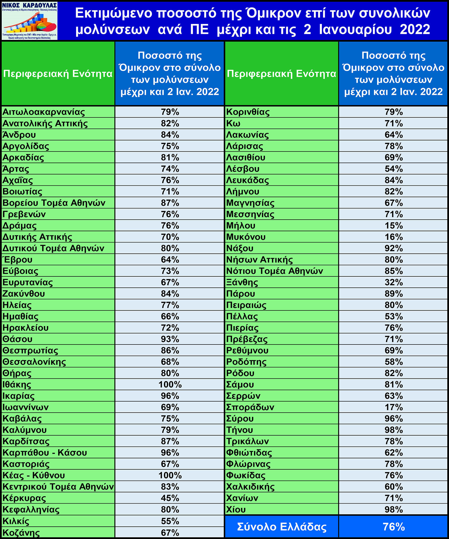Στον παρακάτω πίνακα απεικονίζεται το εκτιμώμενο ποσοστό επί των συνολικών μολύνσεων που αποδίδεται στην Όμικρον, τόσο στην επικράτεια, όσο και ανά Περιφερειακή Ενότητα, με προσομοίωση του μαθηματικού μοντέλου: