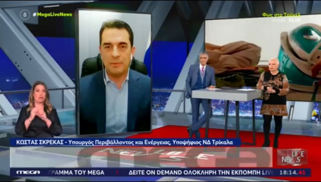 Στο ενεργειακό θαύμα που κατάφερε η χώρα τα τελευταία τρία χρόνια αναφέρθηκε ο υπουργός Περιβάλλοντος και Ενέργειας, Κώστας Σκρέκας, μιλώντας σε ζωντανή σύνδεση από τα Τρίκαλα, στην εκπομπή του Νίκου Ευαγγελάτου LIVE NEWS στο MEGA.