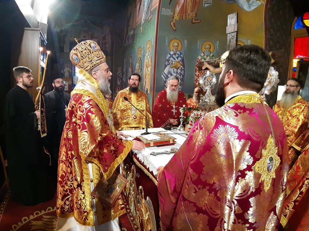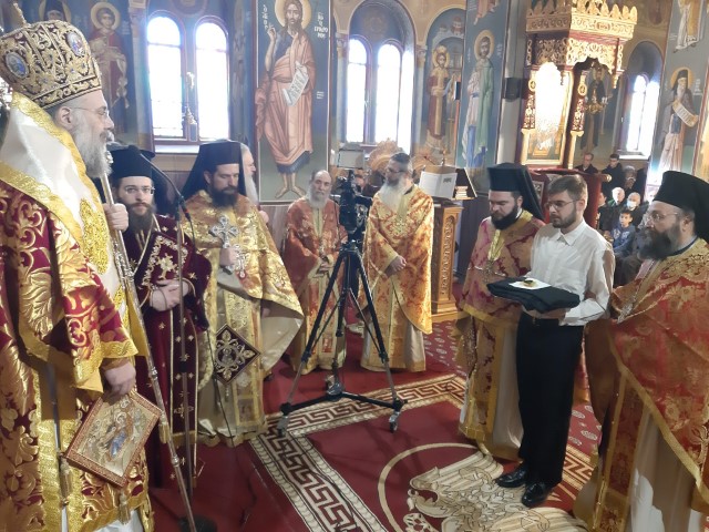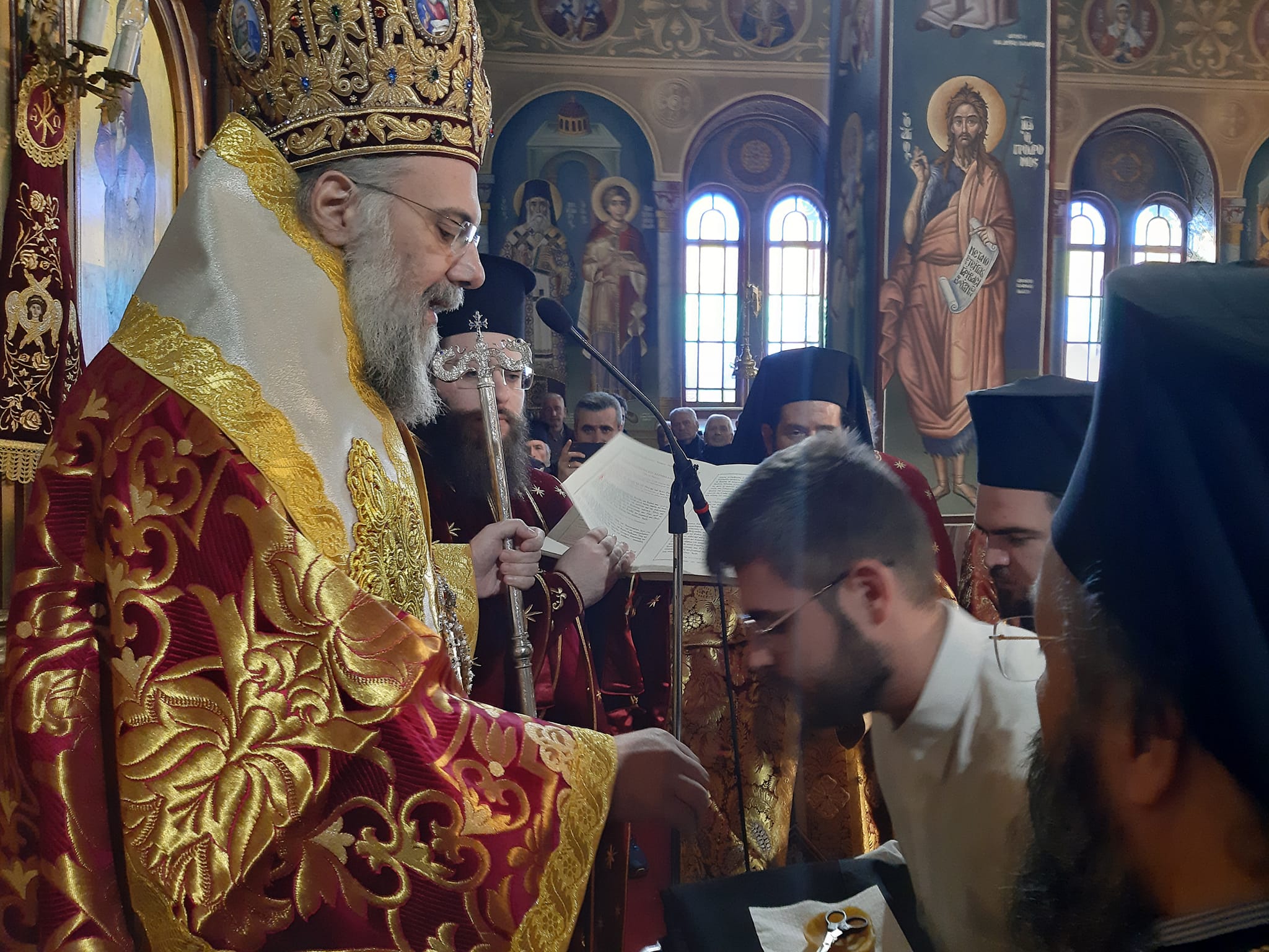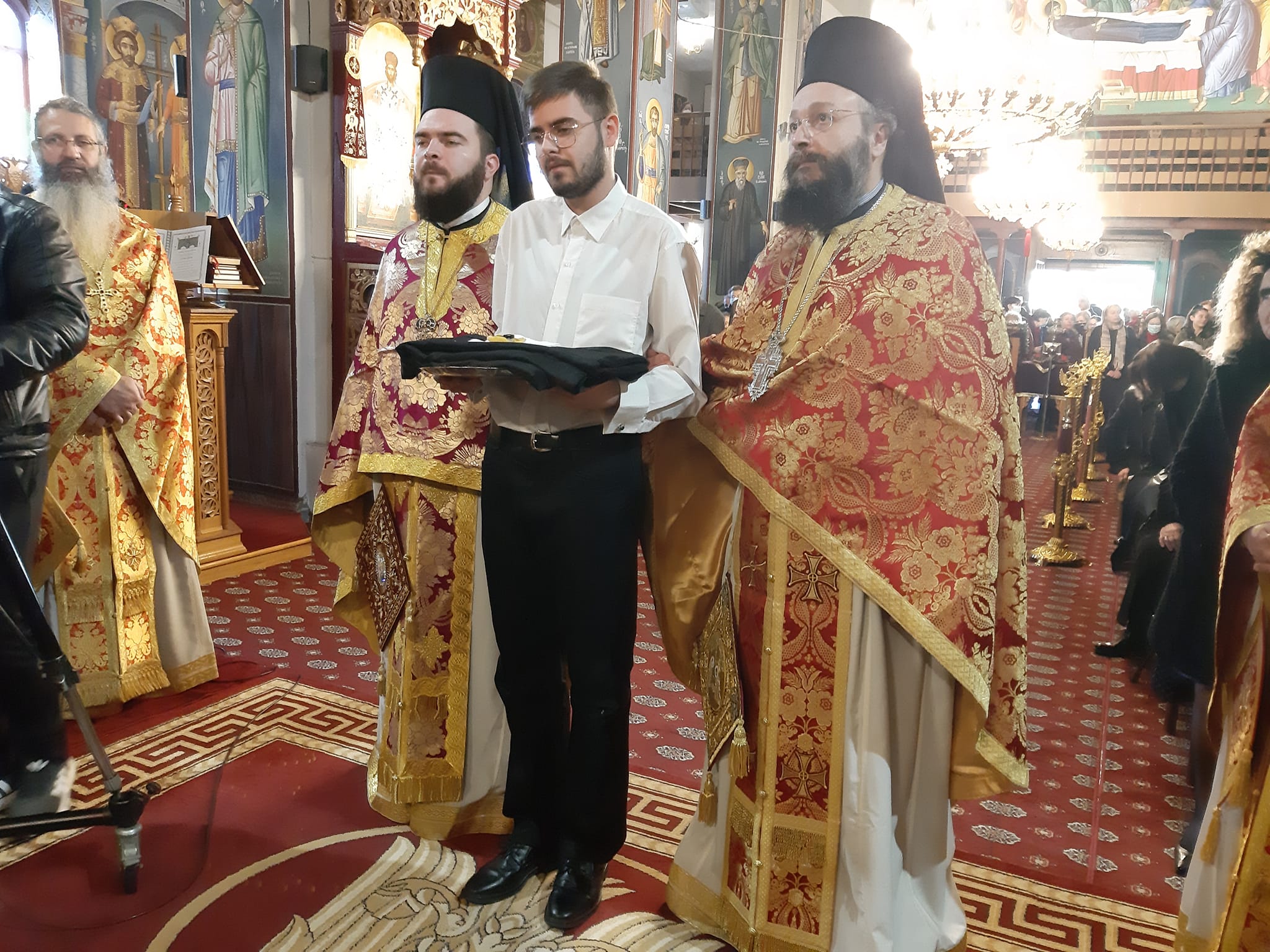 Χθες τελέστηκε πανηγυρικός Εσπερινός και ακολούθως Ιερά Αγρυπνία, ενώ το πρωί της Τετάρτης, κυριώνυμο ημέρα της εορτής του Αγίου Στεφάνου, ο Μητροπολίτης Τρίκκης Χρυσόστομος προεξήρχε πανηγυρικής Θείας Λειτουργίας. Με το πέρας αυτής και προ της Απολύσεως εκτυλίχθηκαν συγκινητικές στιγμές, καθώς ο κ. Χρυσόστομος χειροθέτησε σε Αναγνώστη ένα από τα αγαπημένα του παιδιά, που δείχνουν αγάπη και αφοσίωση στην Εκκλησία, τον Σωτήρη Παπαθανασίου, γιο του γνωστού δημοσιογράφου της πόλης Χριστόφορου Παπαθανασίου. Όπως κατέγραψε το trikalavoice.gr μίλησε με λόγους πατρικούς και συμβούλευσε τον νέο να συνεχίσει να πορεύεται στον ίδιο δρόμο, ενώ ο νέος Αναγνώστης ευχαρίστησε τόσο τον Επίσκοπο, όσο και τον πνευματικό του πατέρα π. Νικόδημο Δράκο και τους εφημερίους του Ναού Αγίου Στεφάνου όπου διακονεί, π. Εφραίμ Γιαννάκο και π. Αναστάσιο Γκαβοτζήμα.