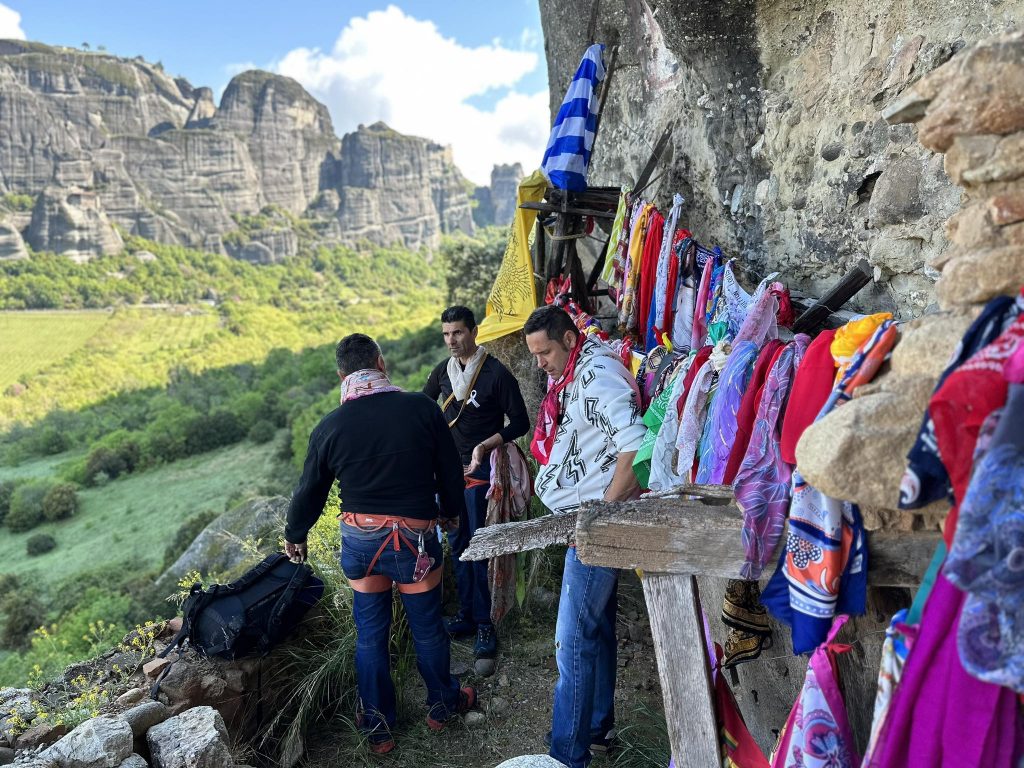 Σε συγκινησιακά φορτισμένο κλίμα τηρήθηκε και φέτος το έθιμο με την αναρρίχηση και την τοποθέτηση των μαντηλιών στις σκήτες του Αϊ Γιώργη του Μαντηλά στα Άγια Μετέωρα. Η σκήτη βρίσκεται πάνω από το Καστράκι, το οποίο πενθεί εδώ και ενάμισι μήνα το χαμό των τριών κοριτσιών, της Αναστασίας, της Χρύσας και της Θώμης, που τόσο άδικα έχασαν τις ζωές τους στο τραγικό σιδηροδρομικό δυστύχημα των Τεμπών.