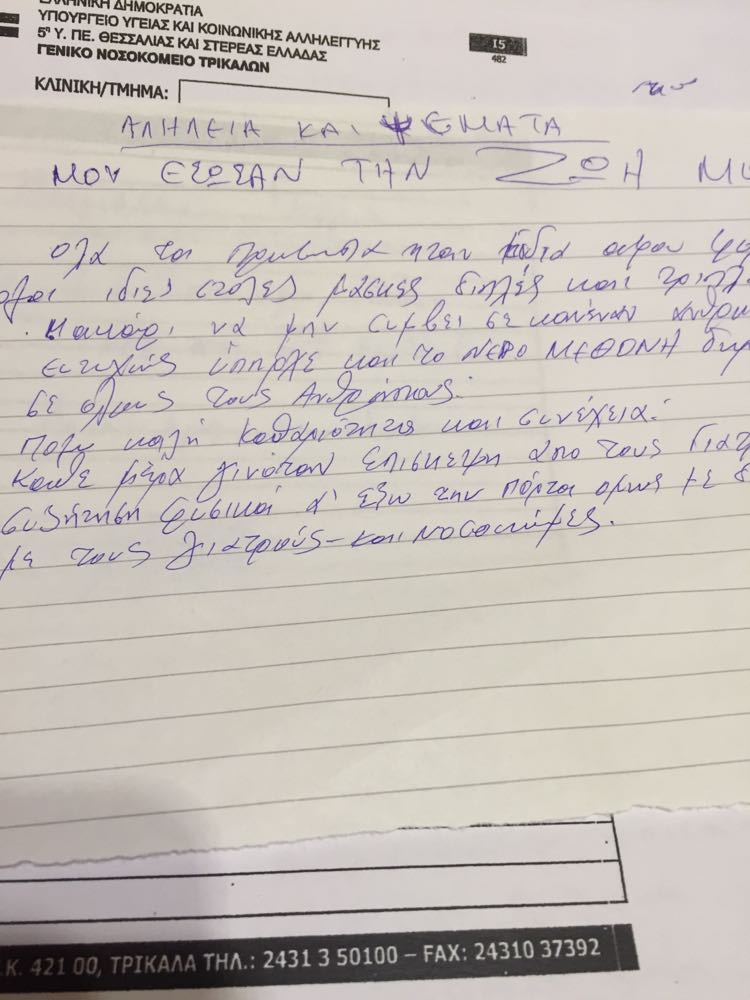 Ο Γ.Μ. αναρρώνει σπίτι του πια όντας καλά στην υγεία του, ενώ σε ένα πρόχειρο χαρτί κράτησε το «ημερολόγιο» της νοσηλείας του: