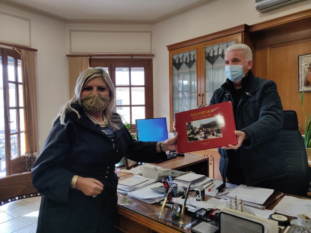 Ο Δήμαρχος αφού ευχαρίστησε για άλλη μια φορά την κ. Ξυνοπούλου της δώρισε την εικόνα της Παναγίας και το λεύκωμα ΚΑΛΑΜΠΑΚΑ «Ταξίδι στο Παρελθόν».