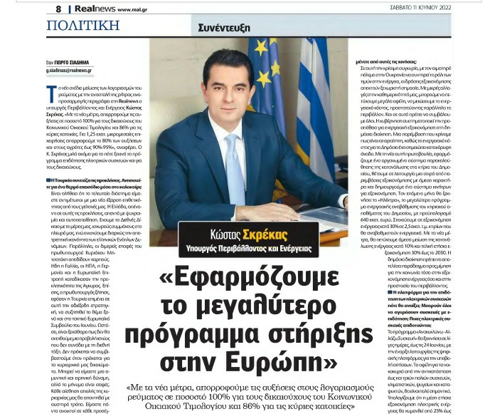 Συνέντευξη του Υπουργού Περιβάλλοντος και Ενέργειας, Κώστα Σκρέκα, στην εφημερίδα Real News – «Εφαρμόζουμε το μεγαλύτερο πρόγραμμα στήριξης στην Ευρώπη».
