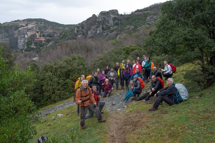 Η μεγάλη ομάδα μας των 30 περίπου ατόμων κινείται αργά στο στενό μονοπάτι ρίχνοντας κλεφτές ματιές στα θεόρατα βράχια που κρέμονται πάνω από τα κεφάλια μας. Νεροσυρμές χαράζουν τη ράχη τους κυλώντας χαμηλότερα. Είναι η μυστηριακή ώρα του Μετεωρίτικου τοπίου, μια από αυτές που πλάθει το πέτρινο δάσος αλλάζοντας ανεπαίσθητα αλλά σταθερά τη μορφή του.