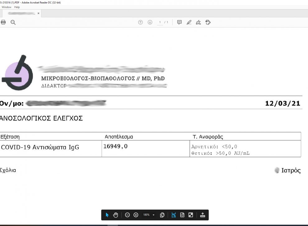 Εντυπωσιακά τα αποτελέσματα ανοσολογικού ελέγχου στα οποία υποβλήθηκε γνωστός γιατρός των Τρικάλων ένα μήνα και πλέον μετά και τη δεύτερη δόση του εμβολίου (της Pfizer) το οποίο έλαβε.