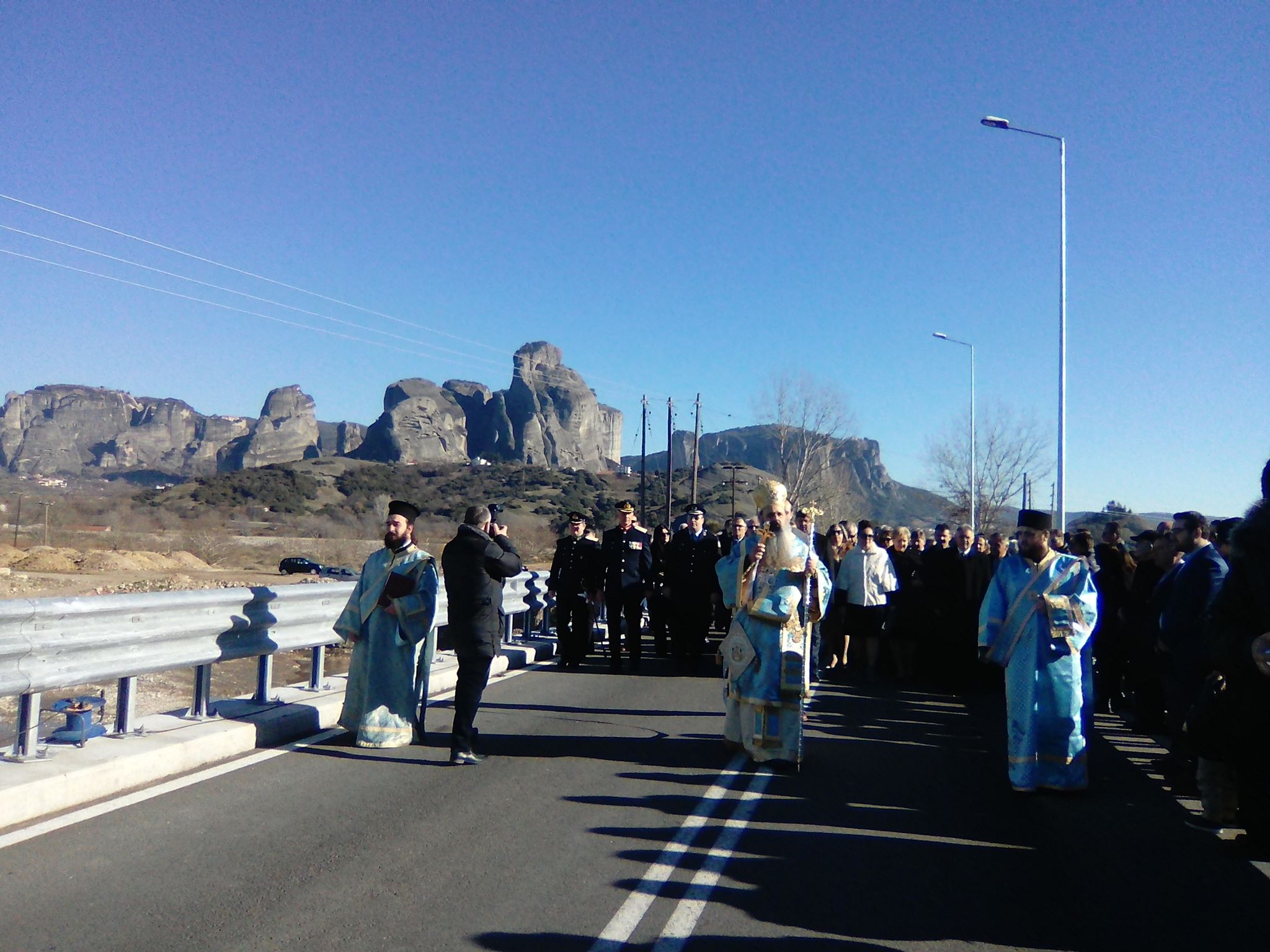 Μετά την τέλεση του Μεγάλου Αγιασμού, για πρώτη φορά φέτος, σχηματίστηκε πομπή αρχών και πιστών, μέχρι τη γέφυρα της Διάβας η οποία αναστηλώθηκε εκ βάθρων προ μηνών και έπειτα από τις καταστροφικές πλημμύρες του 2016. Εκεί ο Μητροπολίτης Σταγών και Μετεώρων Θεόκλητος, στη σκιά των Αγίων Μετεώρων, τέλεσε την κατάδυση του Τιμίου Σταυρού στα νερά του Πηνειού ποταμού, προς ευλογία πάντων και πασών των πιστών.