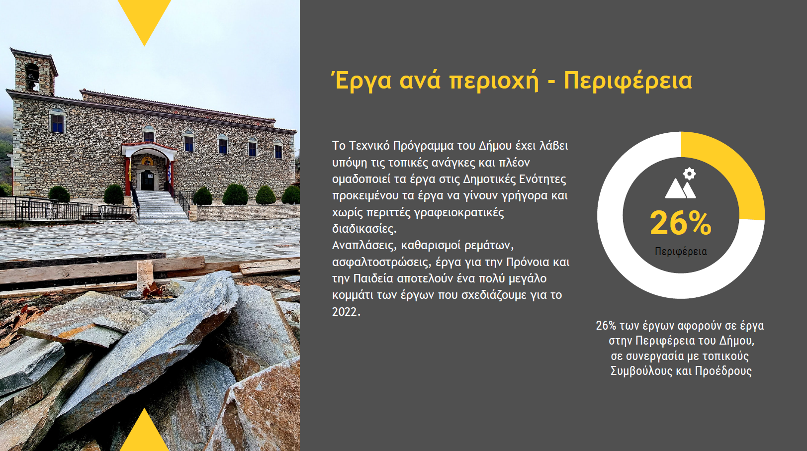 Το 26% των έργων για όλον τον Δήμο Τρικκαίων το 2022 αφορούν στα χωριά. Αυτό επεσήμανε ο Δήμαρχος Τρικκαίων Δημήτρης Παπαστεργίου την Τρίτη 28 Δεκεμβρίου 2021, κατά τη συζήτηση του προϋπολογισμού για την επόμενη χρονιά. Ο Δ. Παπαστεργίου σημείωσε ότι έχουν ληφθεί υπ’ όψιν οι τοπικές ανάγκες, με τη συνεργασία προέδρων και μελών Τοπικών Συμβουλίων. Ακολούθως τα έργα ομαδοποιούνται, προκειμένου να υλοποιηθούν πιο γρήγορα και χωρίς περιττές γραφειοκρατικές διαδικασίες.