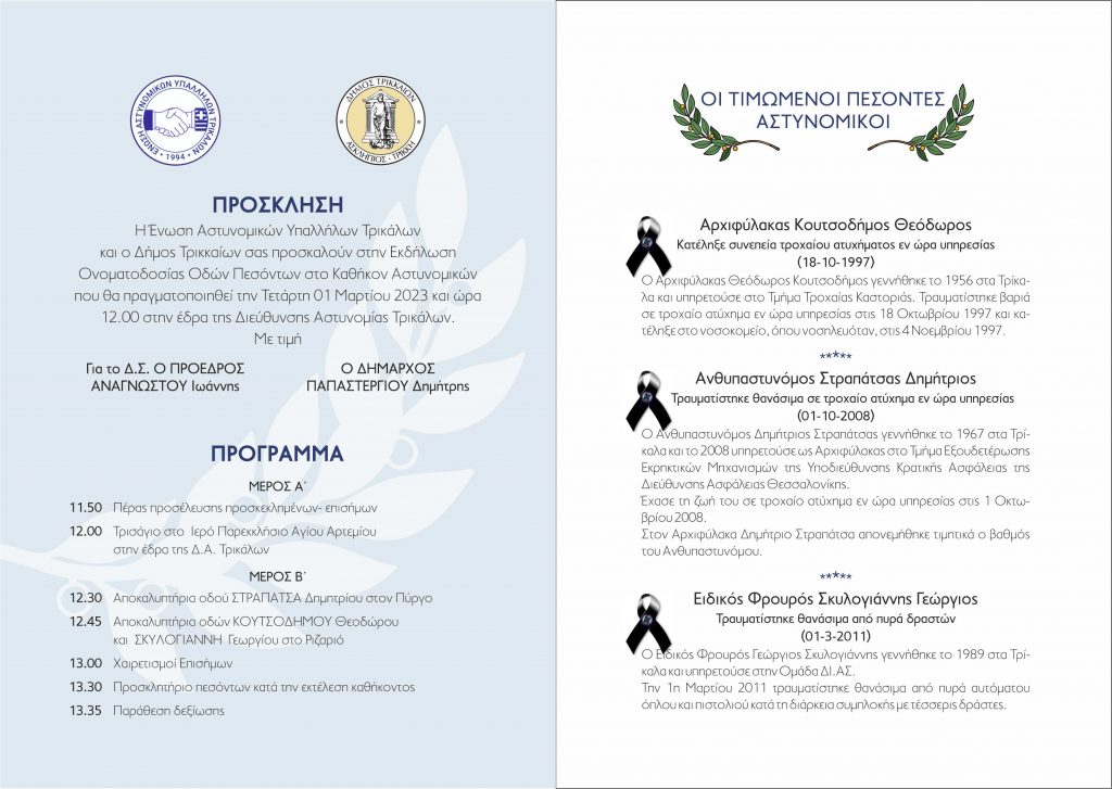 Ένα χρέος τιμής της ΕΛ.ΑΣ. και του Δήμου Τρικκαίων αποδίδεται την ερχόμενη Τετάρτη 1η Μαρτίου σε αστυνομικούς οι οποίοι έπεσαν στο καθήκον.