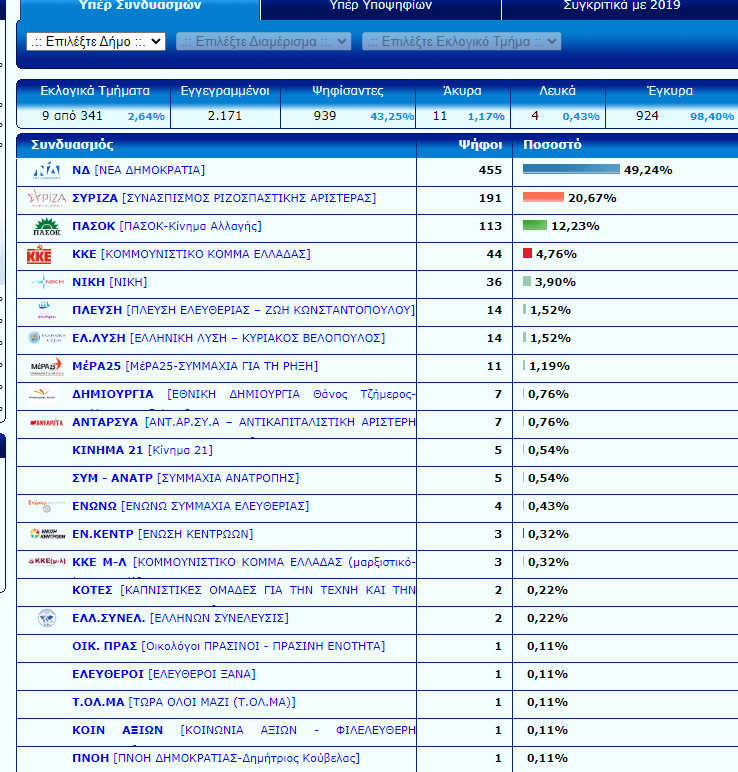 Στα πρώτα 9 εκλογικά τμήματα του ν. Τρικάλων τα αποτελέσματα έχουν ως εξής: