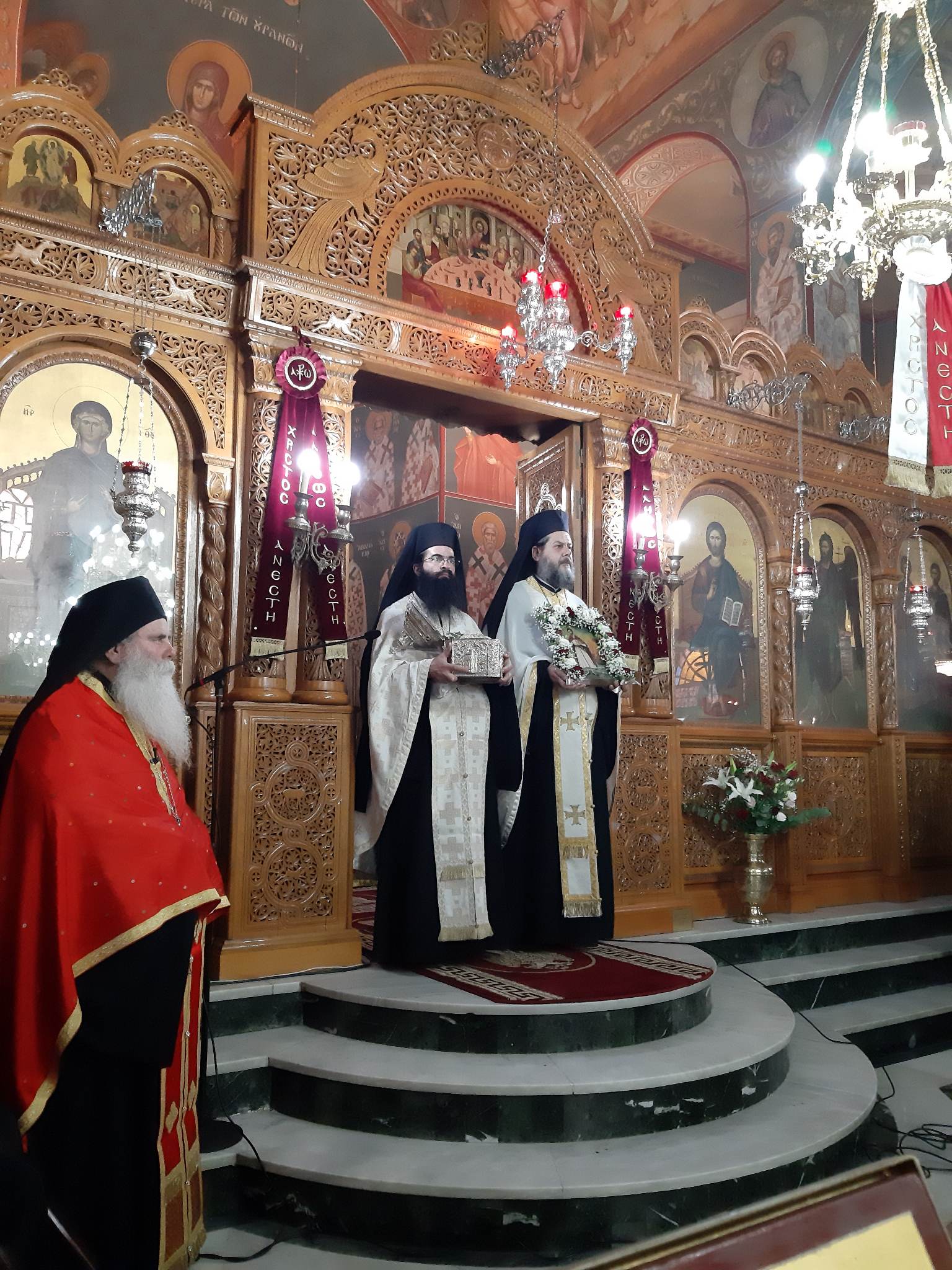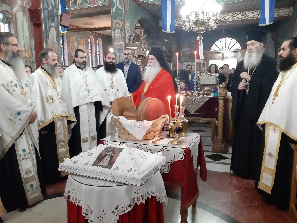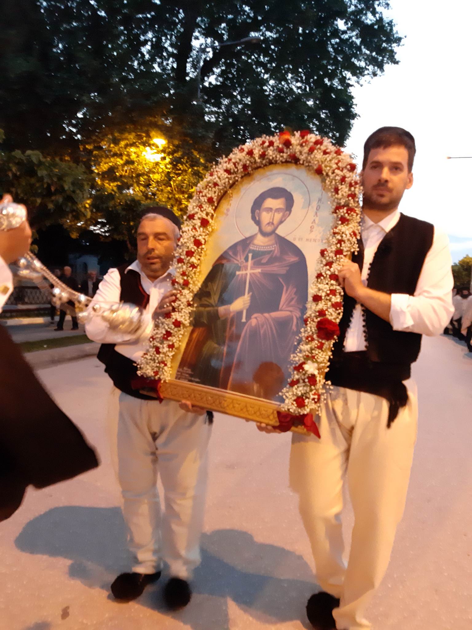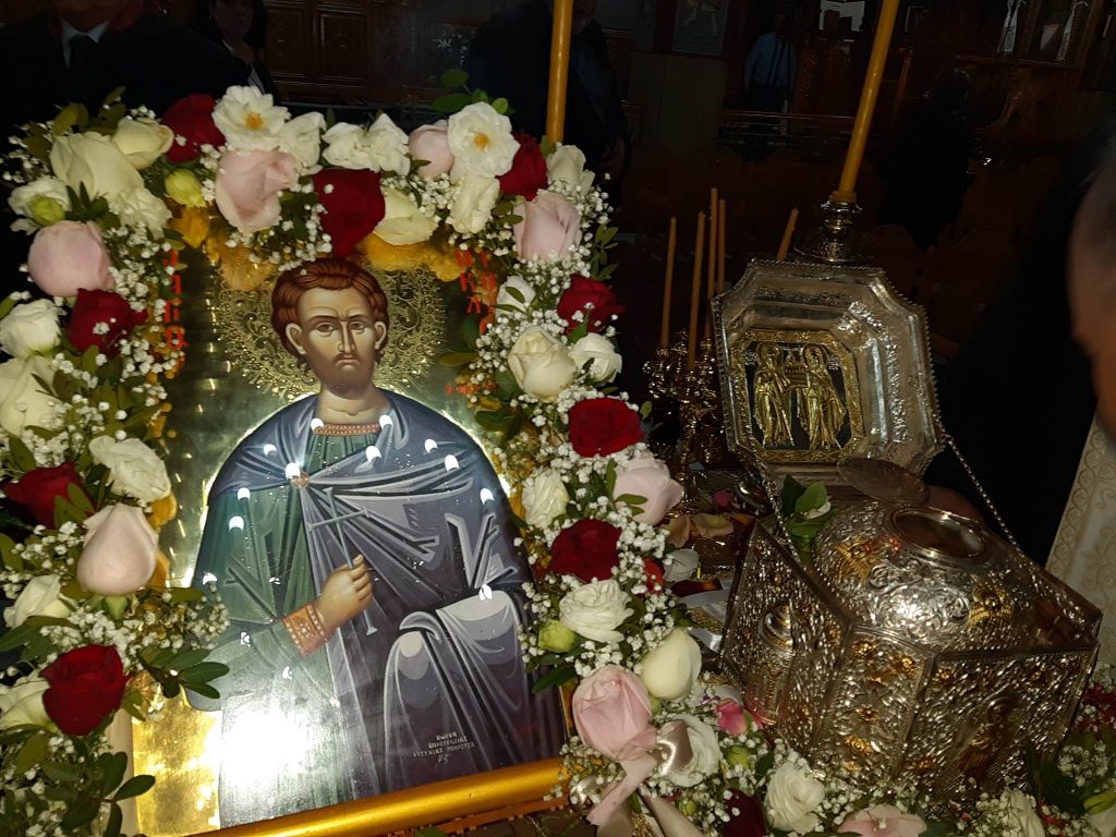 Το απόγευμα της Τρίτης, όπως κατέγραψε το trikalavoice.gr, έγινε η υποδοχή της Τιμίας Κάρας του Αγίου η οποία φυλάσσεται στην Ιερά Μονή Βαρλαάμ των Μετεώρων και την οποία κόμισε ο αδελφός αυτής, ιερομόναχος Βαρλαάμ, στον φερώνυμο Ιερό Ναό Αγίου Νικολάου εκ Μετσόβου στην Πράσινη Γωνιά. Εκεί τελέστηκε Μέγας Αρχιερατικός Εσπερινός χοροστατούντος του αγίου Δορυλαίου Δαμασκηνού, συγχοροστατούντων του Μητροπολίτου Λαγκαδά Πλάτωνος, του κυριάρχου Μητροπολίτου Τρίκκης , Γαρδικίου και Πύλης Χρυσοστόμου, και τη συμμετοχή δεκάδων ιερέων της Μητροπόλεως. Ακολούθησε η λιτάνευση της Τιμίας Κάρας του Αγίου επί της οδού Καλαμπάκας. Μετά το πέρας του Εσπερινού ο φιλακόλουθος και ευσεβής εφημέριος του Ναού, Πρωτοπρεσβύτερος Δημήτριος Κυρίτσης, προσέφερε παραδοσιακή φιλοξενία για όλους.