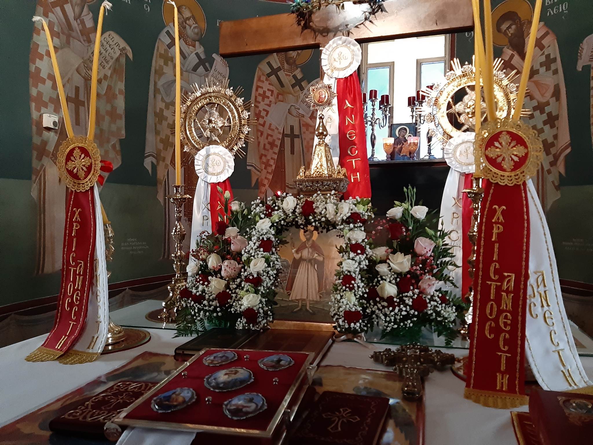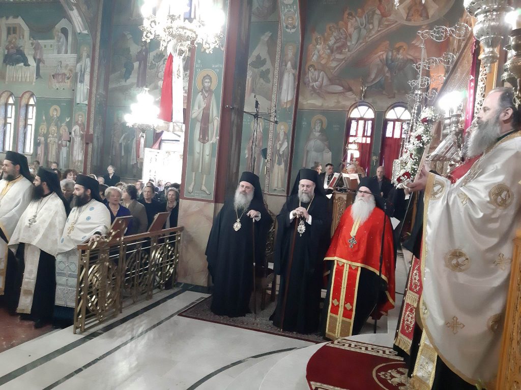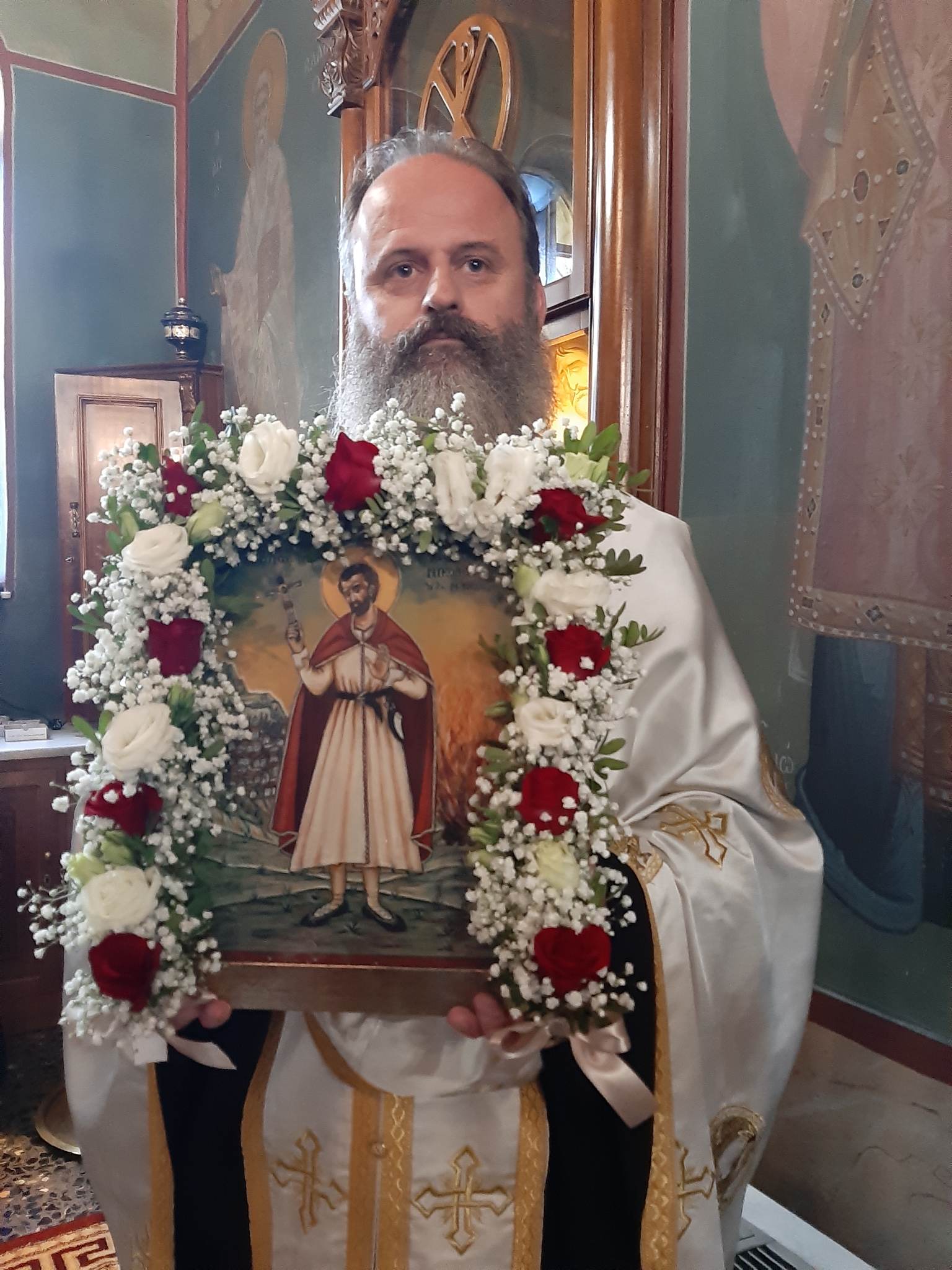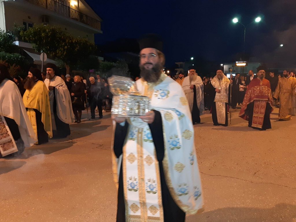 Το απόγευμα της Τρίτης, όπως κατέγραψε το trikalavoice.gr, έγινε η υποδοχή της Τιμίας Κάρας του Αγίου η οποία φυλάσσεται στην Ιερά Μονή Βαρλαάμ των Μετεώρων και την οποία κόμισε ο αδελφός αυτής, ιερομόναχος Βαρλαάμ, στον φερώνυμο Ιερό Ναό Αγίου Νικολάου εκ Μετσόβου στην Πράσινη Γωνιά. Εκεί τελέστηκε Μέγας Αρχιερατικός Εσπερινός χοροστατούντος του αγίου Δορυλαίου Δαμασκηνού, συγχοροστατούντων του Μητροπολίτου Λαγκαδά Πλάτωνος, του κυριάρχου Μητροπολίτου Τρίκκης , Γαρδικίου και Πύλης Χρυσοστόμου, και τη συμμετοχή δεκάδων ιερέων της Μητροπόλεως. Ακολούθησε η λιτάνευση της Τιμίας Κάρας του Αγίου επί της οδού Καλαμπάκας. Μετά το πέρας του Εσπερινού ο φιλακόλουθος και ευσεβής εφημέριος του Ναού, Πρωτοπρεσβύτερος Δημήτριος Κυρίτσης, προσέφερε παραδοσιακή φιλοξενία για όλους.