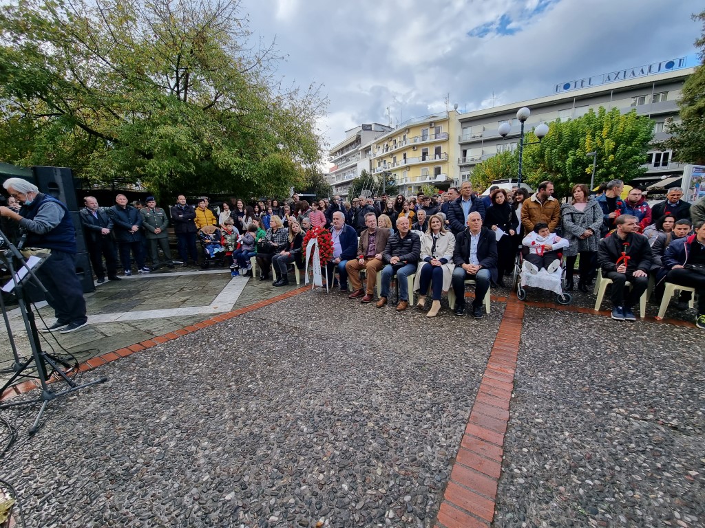 – η απότιση φόρου τιμής με ένα τριαντάφυλλο από τους/τις φιλοξενούμενους/ες του ΚΔΑΠ ΜΕΑ «ΗΦΑΙΣΤΟΣ» του Δήμου Τρικκαίων. Νωρίτερα μάλιστα, είχαν πραγματοποιήσει χωριστή εορταστική εκδήλωση, στον χώρο του ΚΔΑΠ, με το σκετσάκι «Ένα αλλιώτικο μάθημα», της Μάρως Θεοδωράκη.
